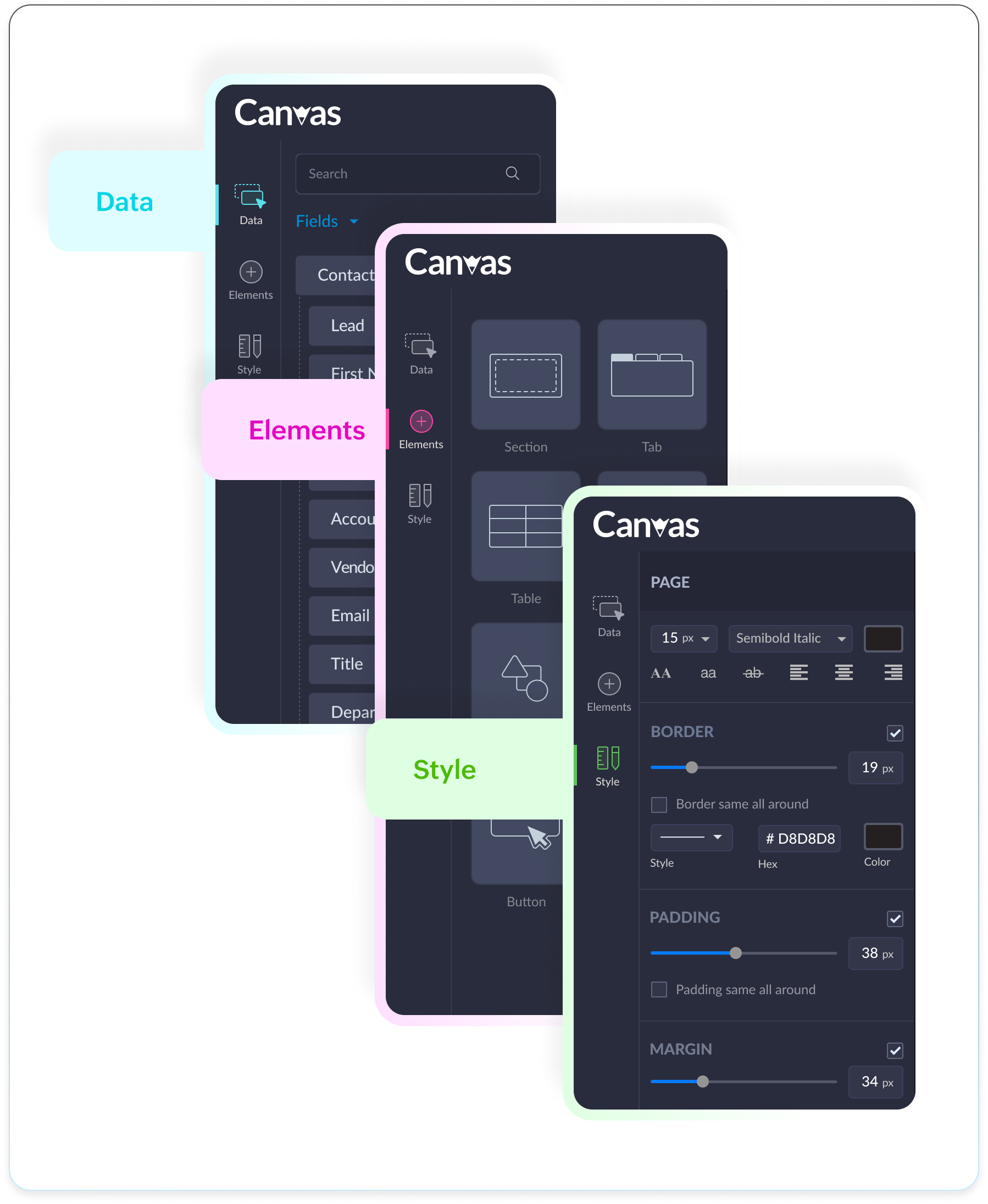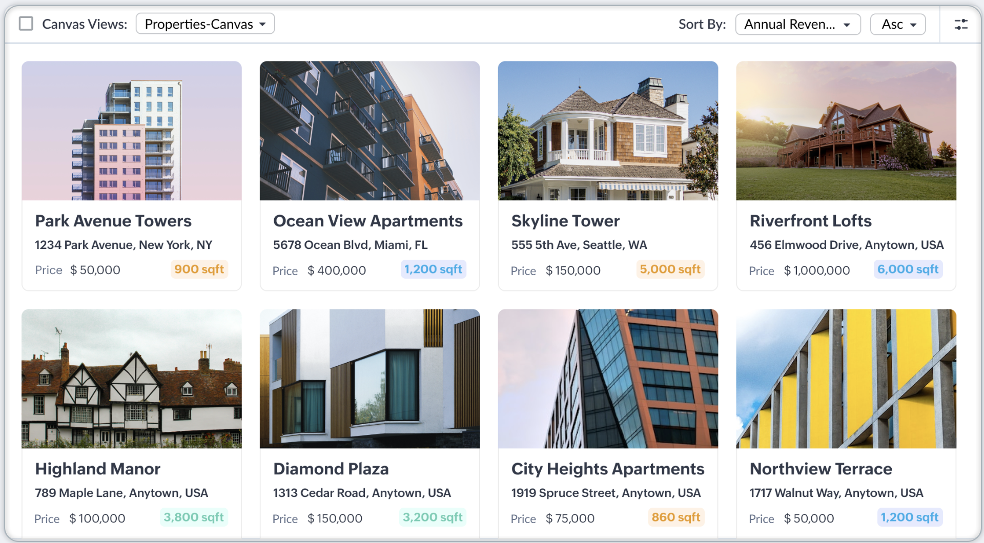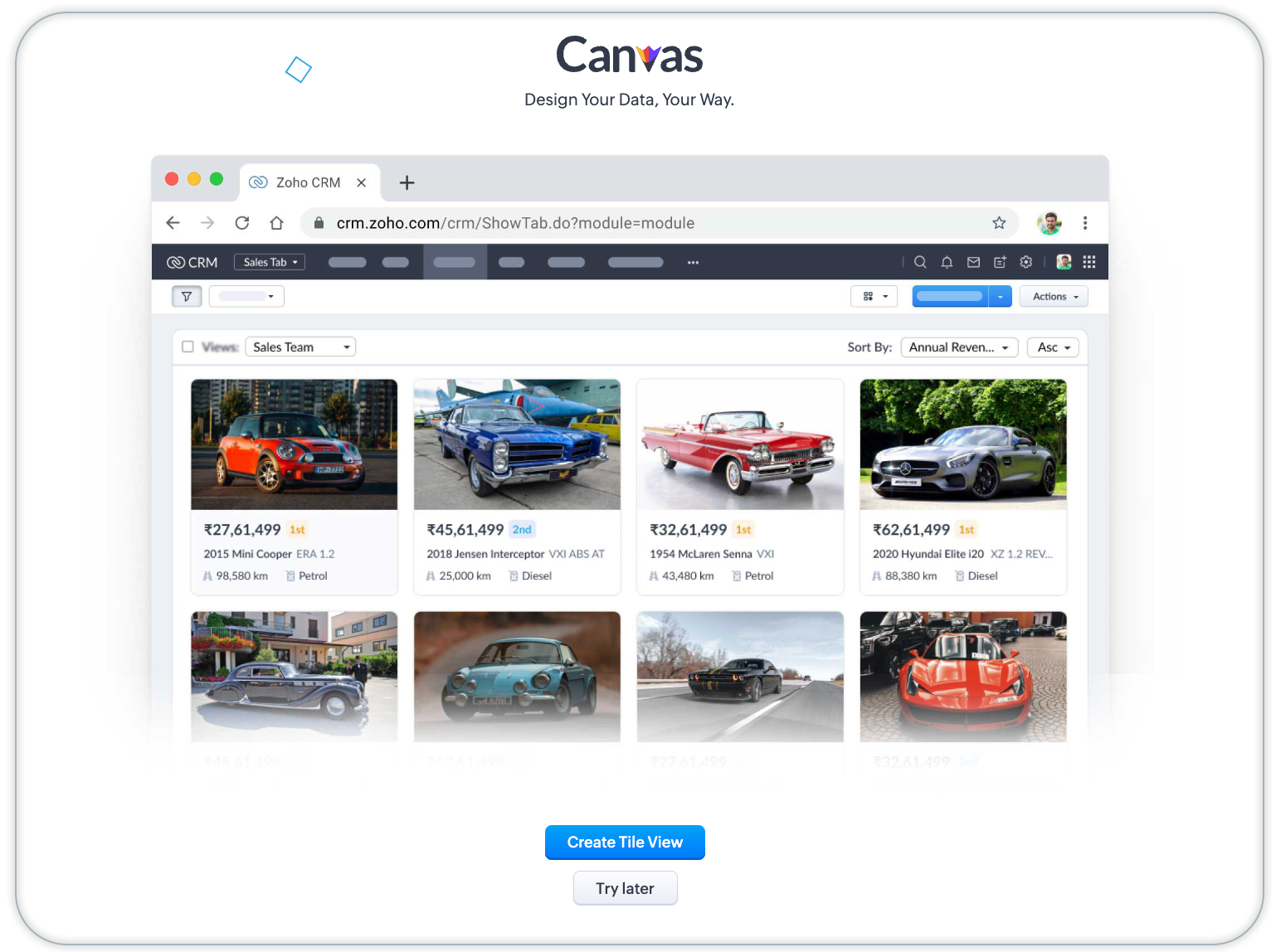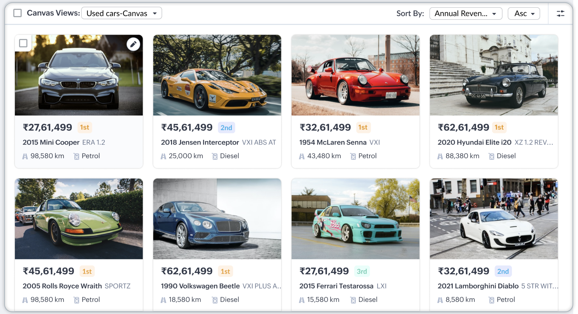- 画布视图是使用我们定制的画布构建器创建的记录的动态定位。 您可以在模块视图中将不同的图形和设计元素合并到您的记录中,以适应您的品牌指导方针和特别的可访问性。 它提供了三种自定义布局 — 自定义列表视图、平铺视图和表格视图 — 以便根据数据类型塑造视图。
