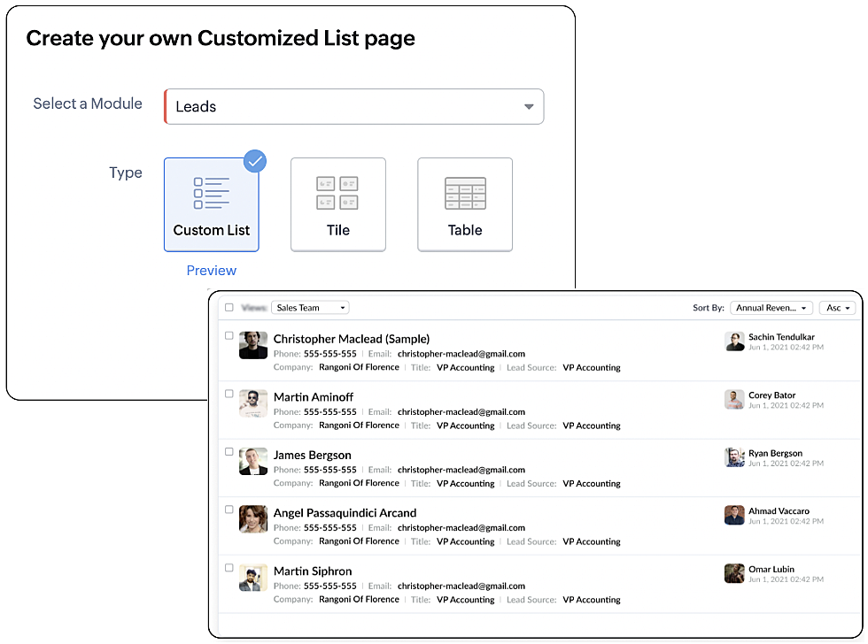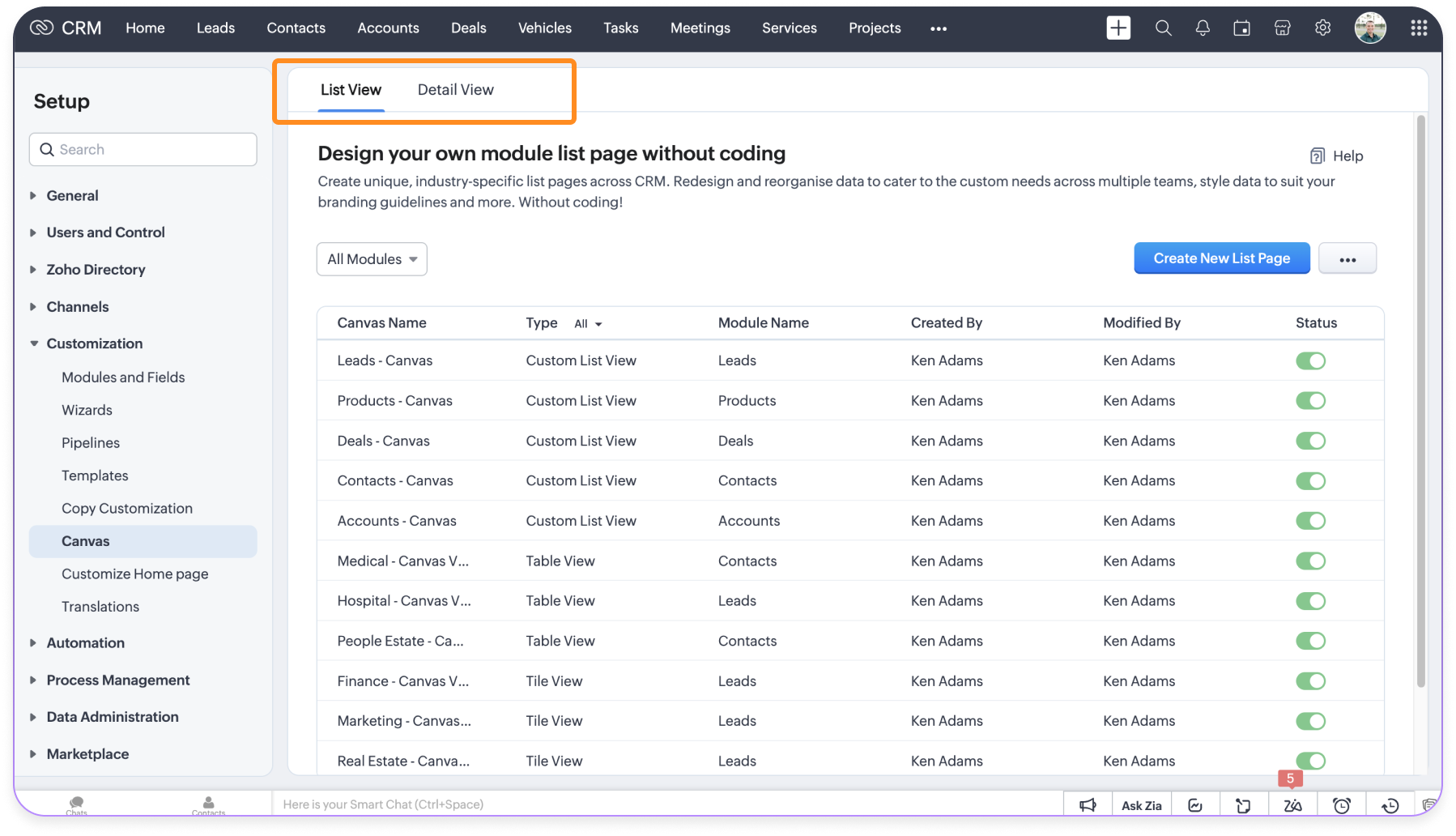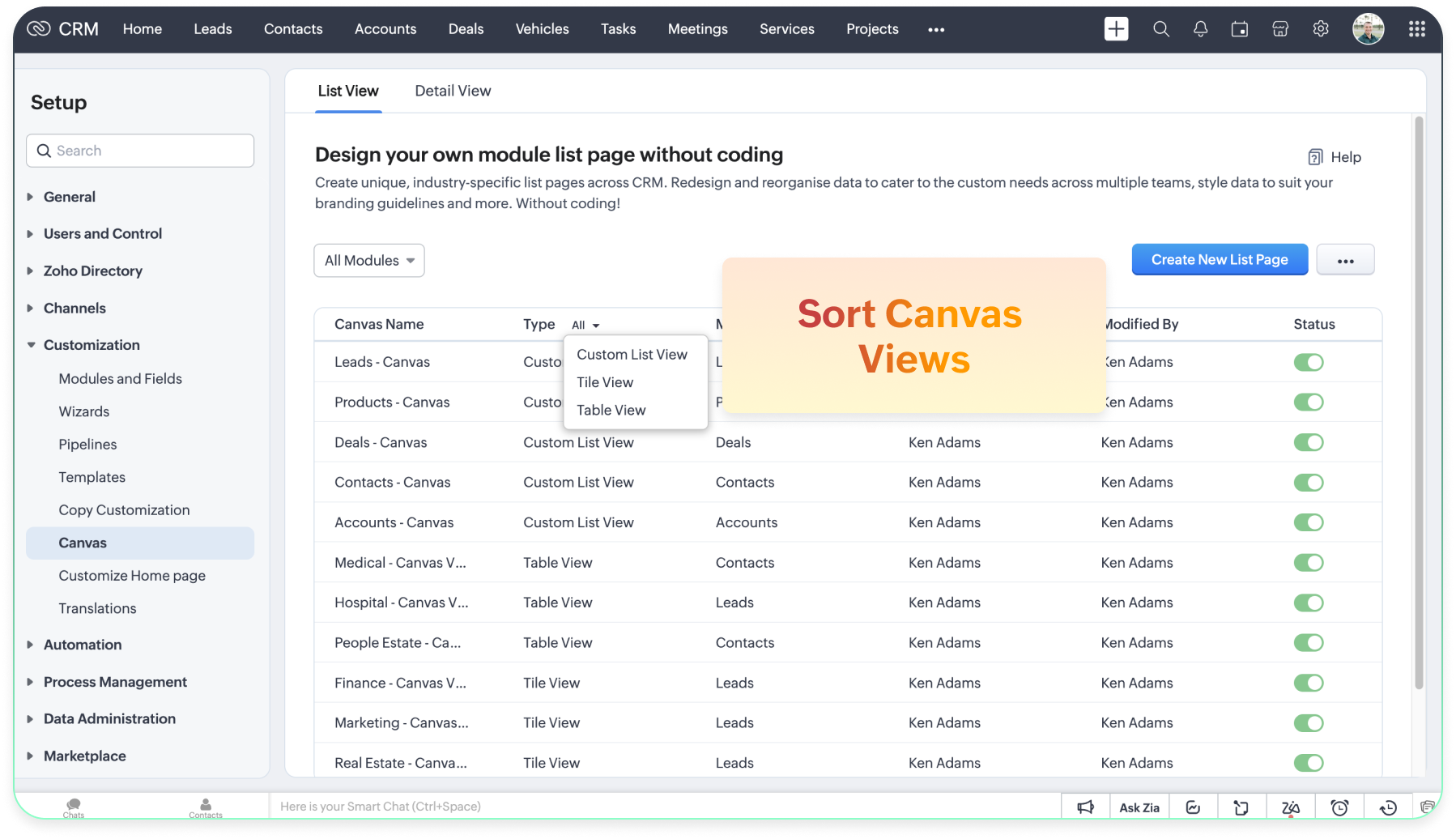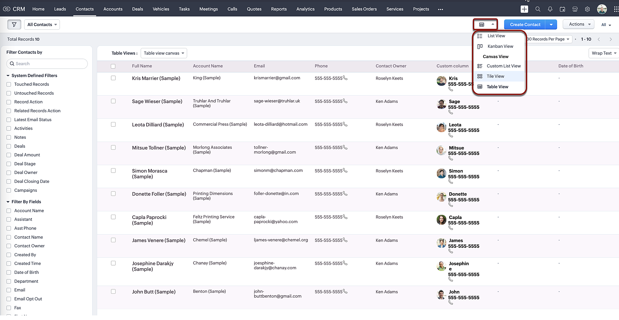 Zoho CRM提供了三种类型的模块视图,因此您可以根据需求组织数据:列表视图、看板视图和画布视图。