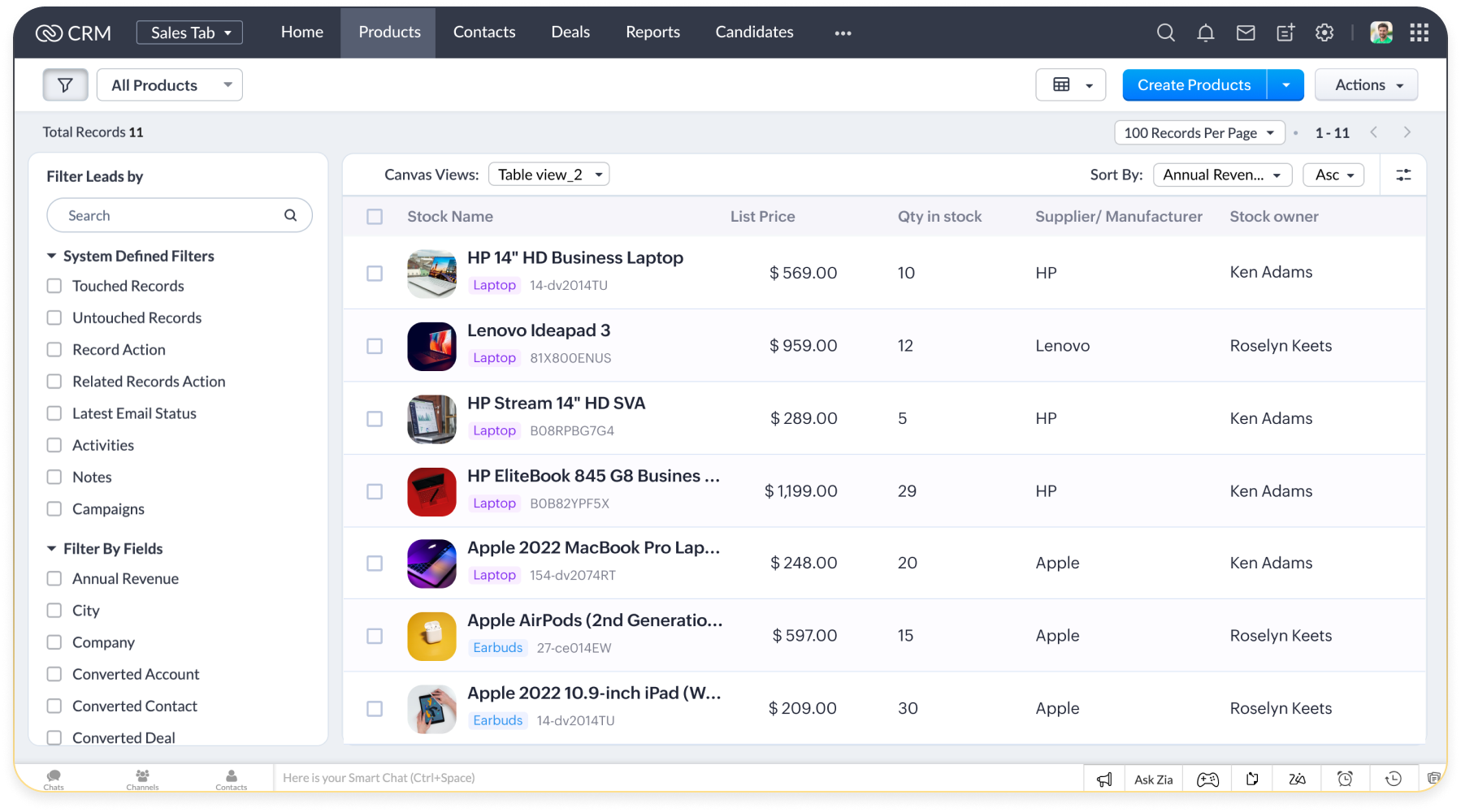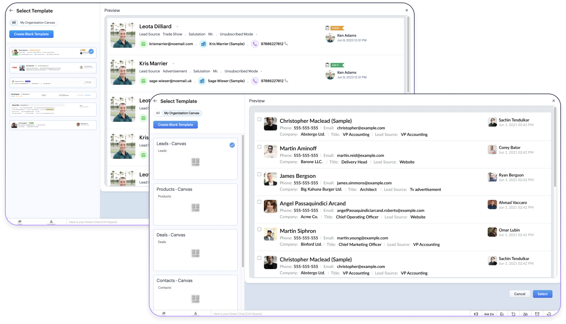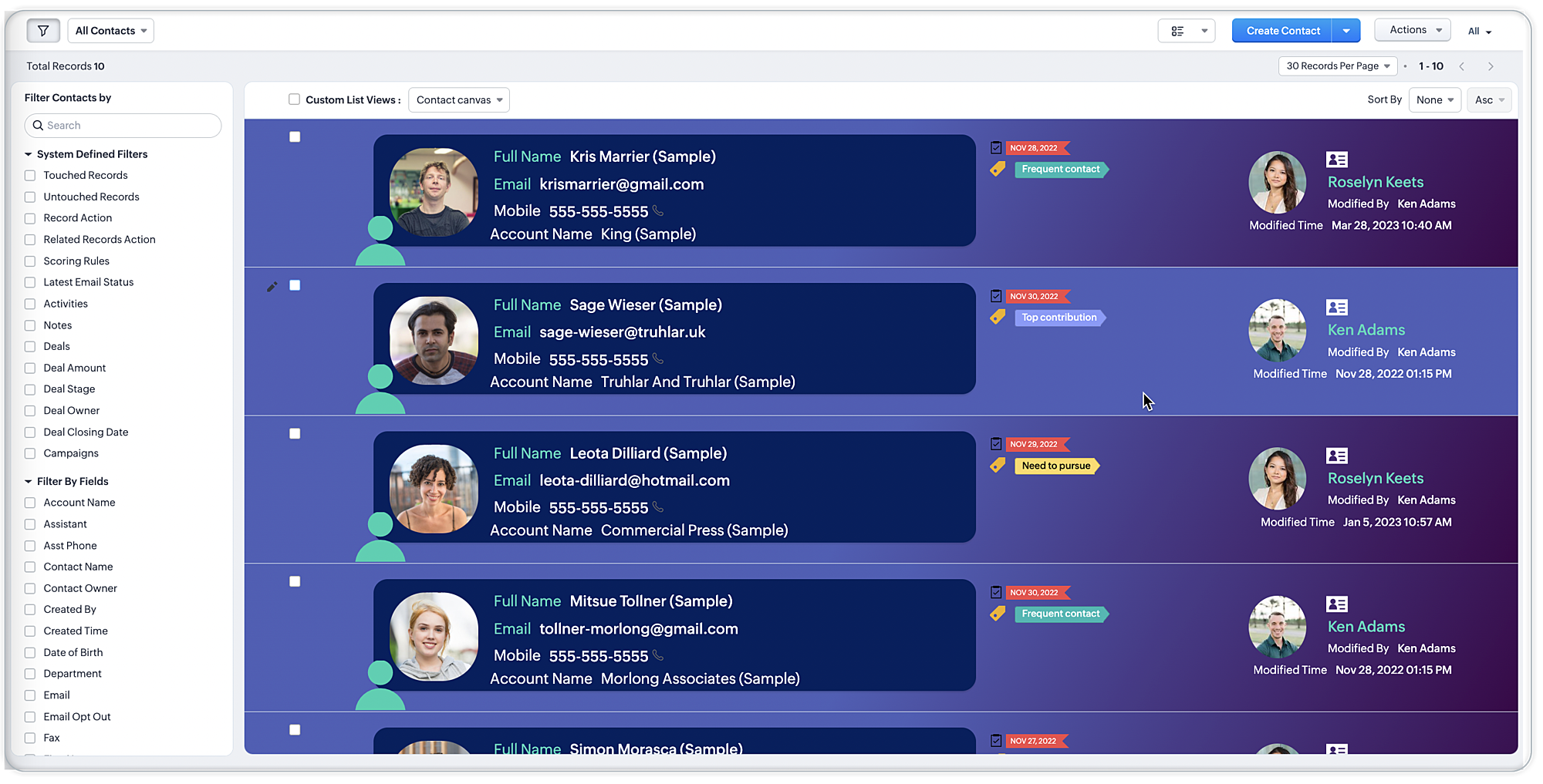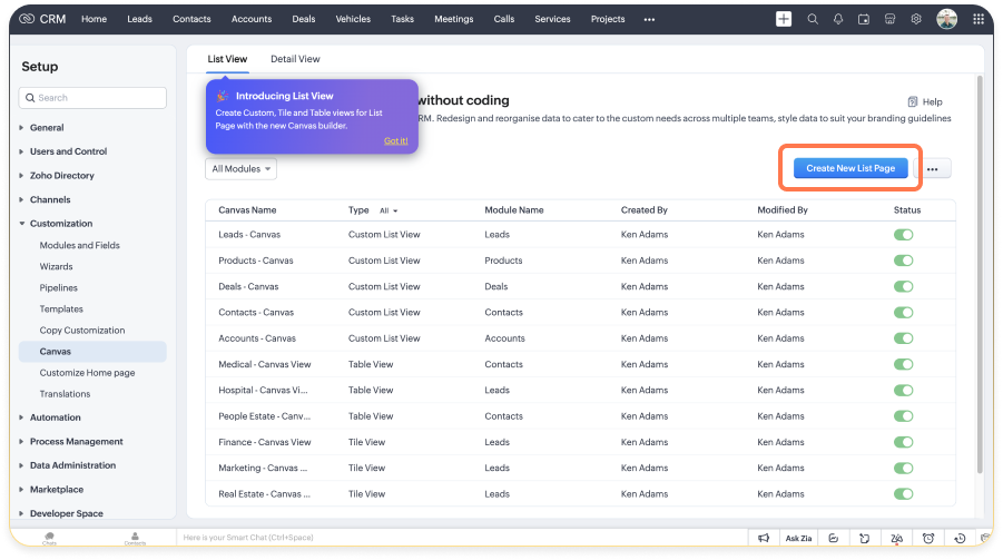 Zoho CRM提供了三种类型的模块视图,因此您可以根据需求组织数据:列表视图、看板视图和画布视图。