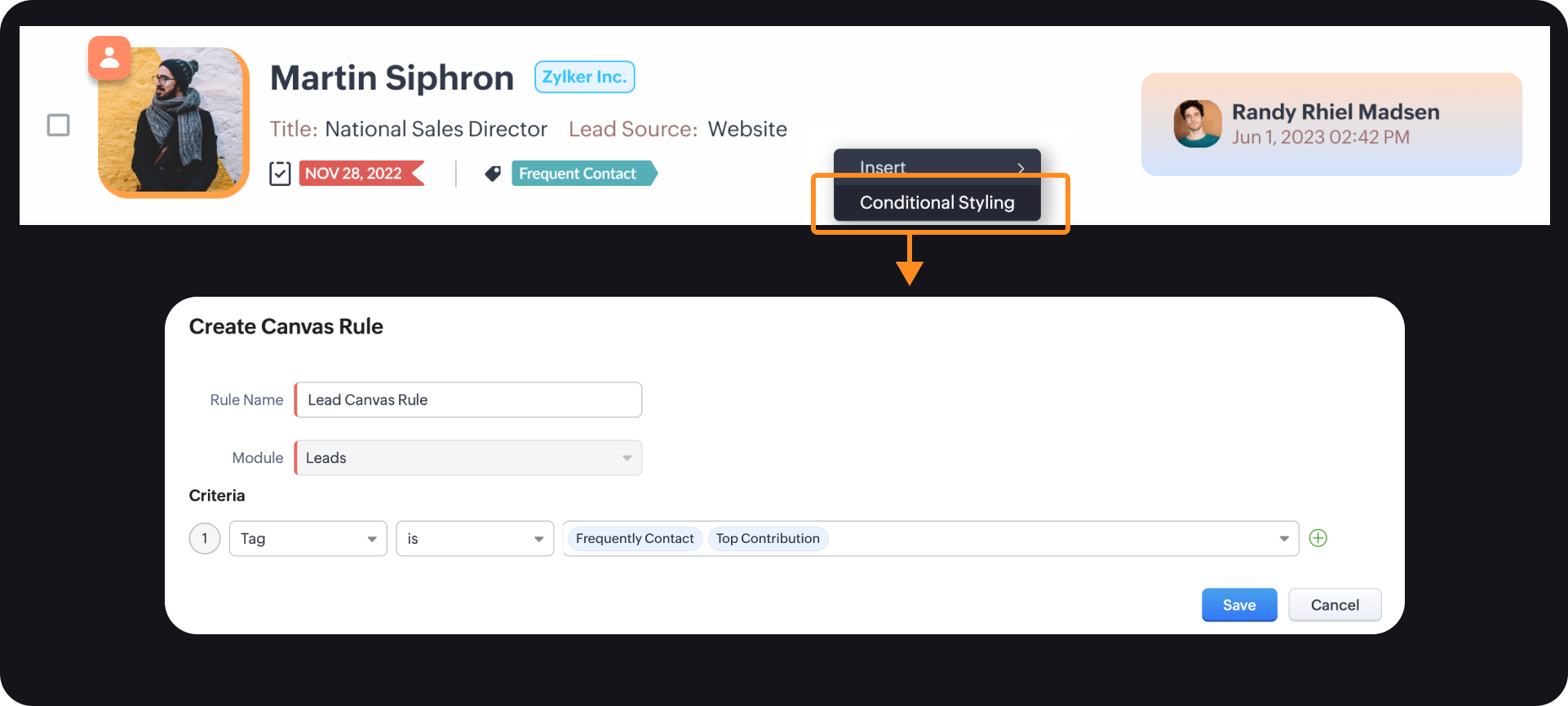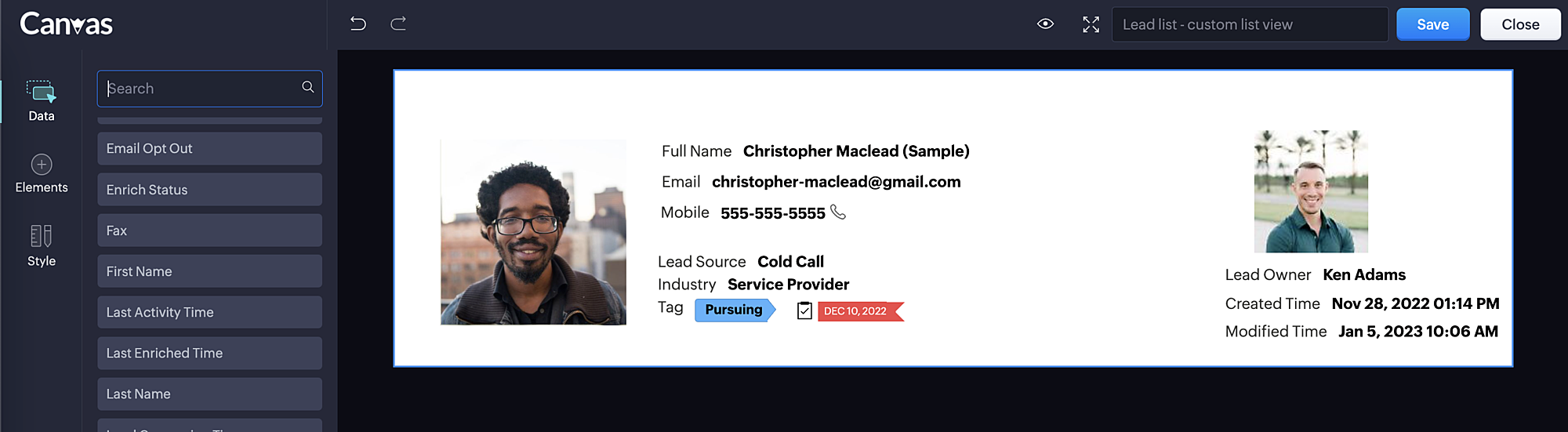 画布是Zoho CRM的尖端设计工作室,使您能够以更有组织的方式创建和呈现数据。 它装载了复杂的设计元素,易于查看和直接使用。