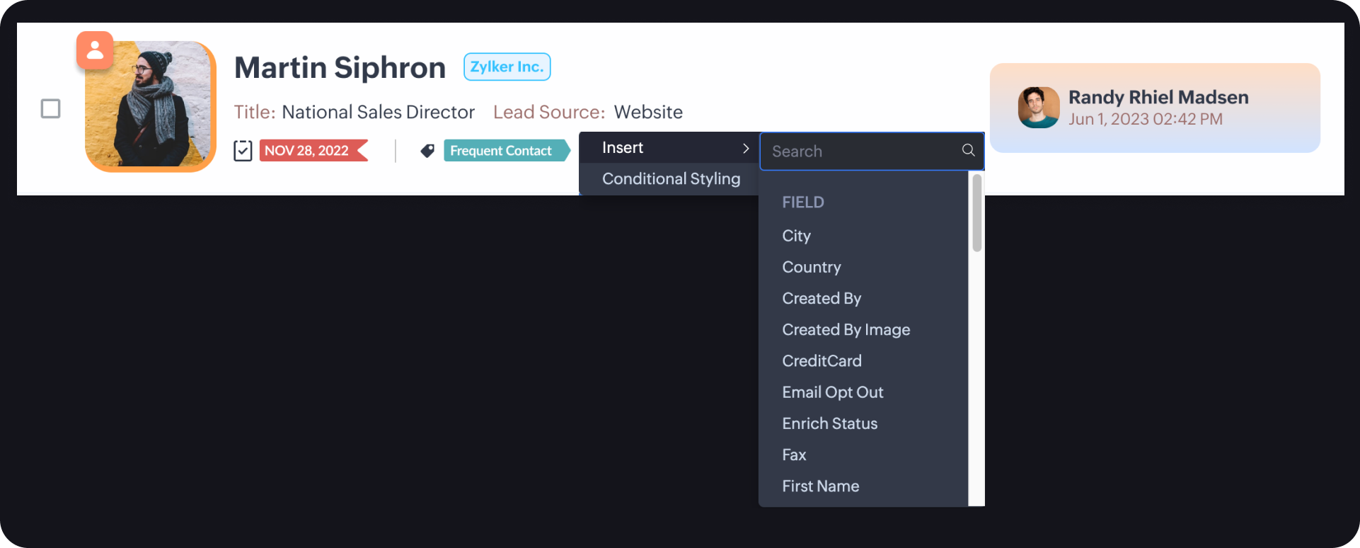 自定义列表视图允许您水平堆叠记录,一个在另一个之上。 每一行提供的空间可以舒适而突出地显示您的企业logo、形象、信息、按钮等。 此视图不杂乱,适合同时存储有关客户和CRM用户的信息。