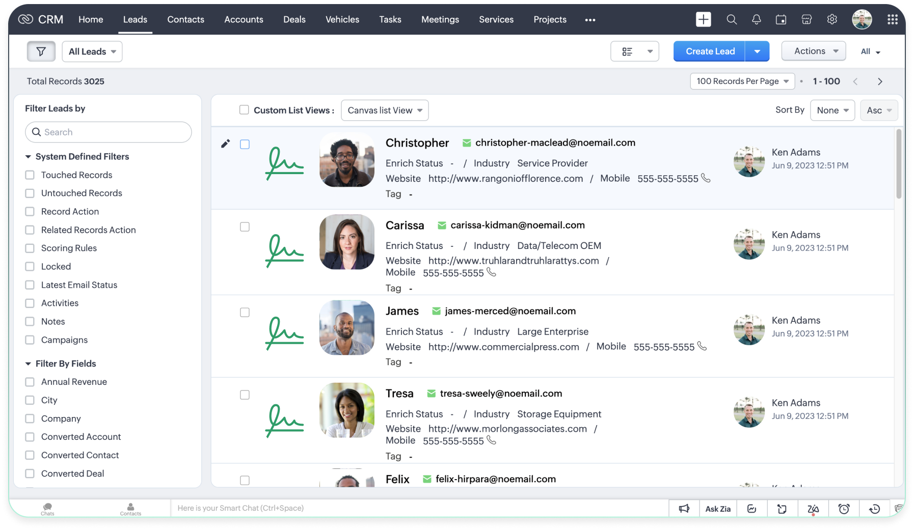 线索信息 : CRM系统的主要活动之一是线索管理。了解线索的需求、角色等等是很重要的。 使用自定义列表视图,您可以以这样一种方式定位您的线索,以便一目了然地获得有关您的线索的有用信息。 使用自定义列表视图,您可以添加线索的图像,以及基本信息,如他们的姓名、电子邮件地址、手机号码、线索来源、标签、分数、线索状态、任务、通话及会议、访问分数、记录所有者等,所有这些都在一个视图中,以最大限度地减少混乱。