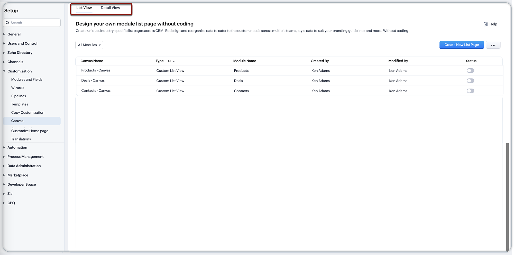 所有为机构创建的模板将在画布页面上显示为行项目。页面列表视图标签包含模块视图,而详细信息页面包含为记录详情页面创建的模板。