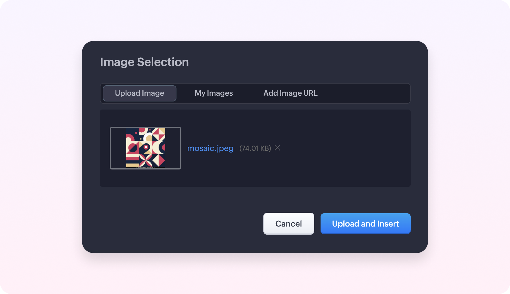 - 选择图片复选框,从您的桌面上传新图片,从图库中选择,或添加图片 URL。