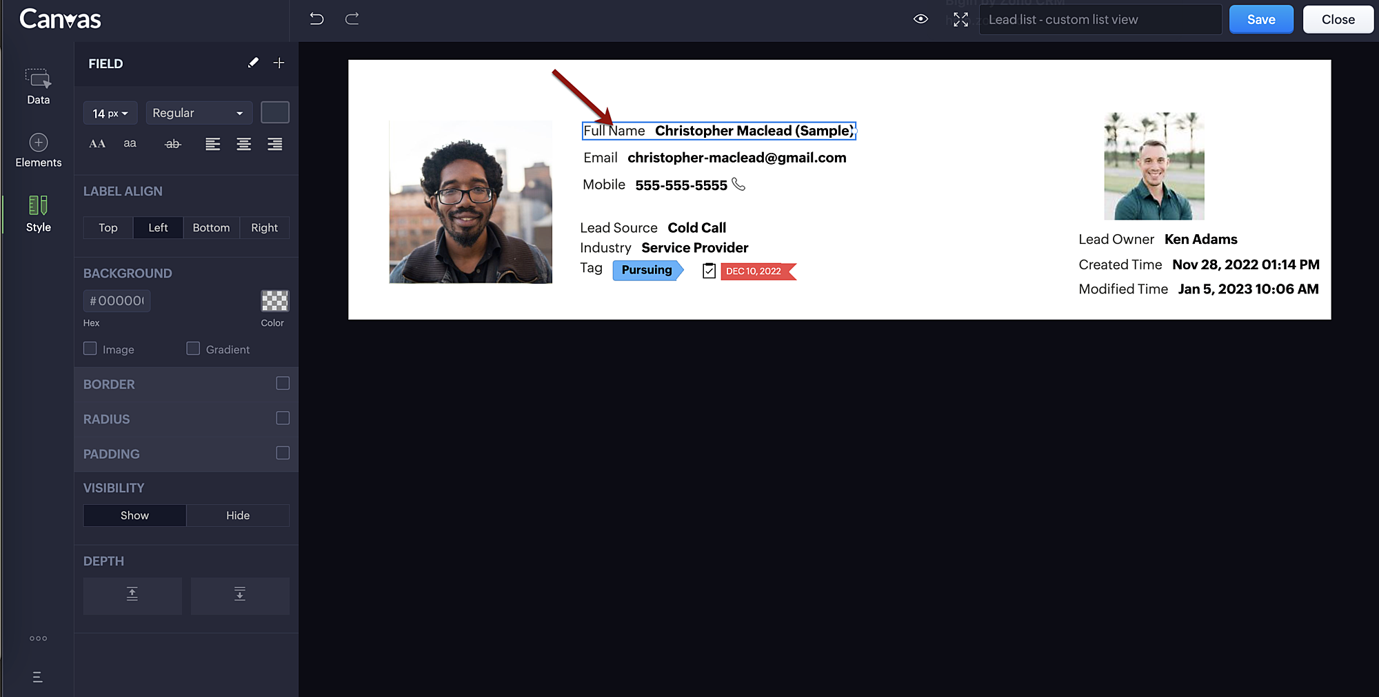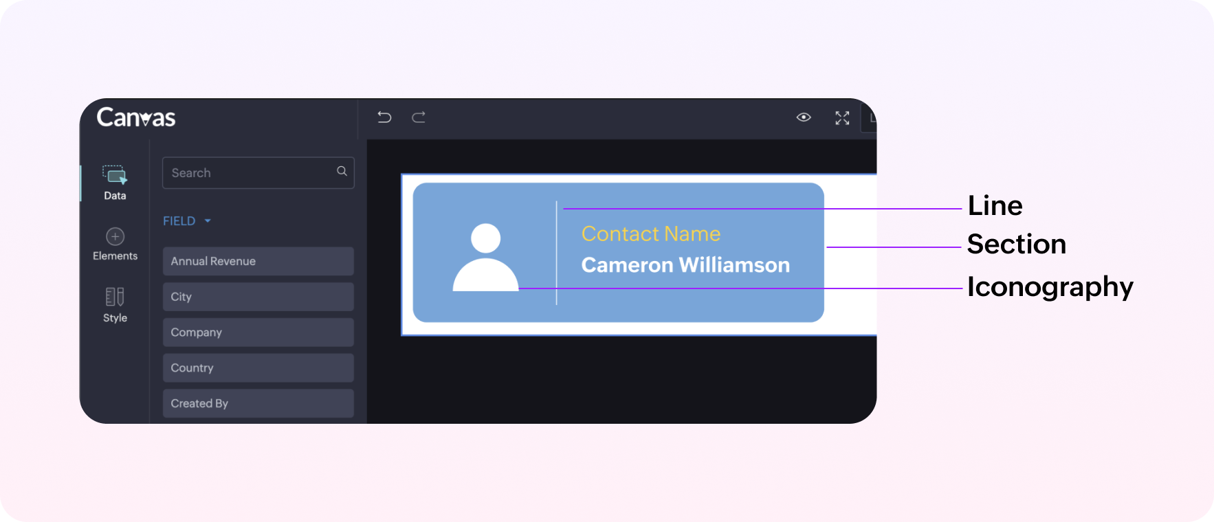 - 数据: 包含所选模块中可用的CRM字段、相关列表、按钮和操作。 通过简单的拖放,您可以将字段放置在画布上的任何位置。