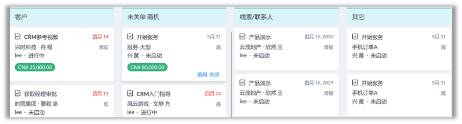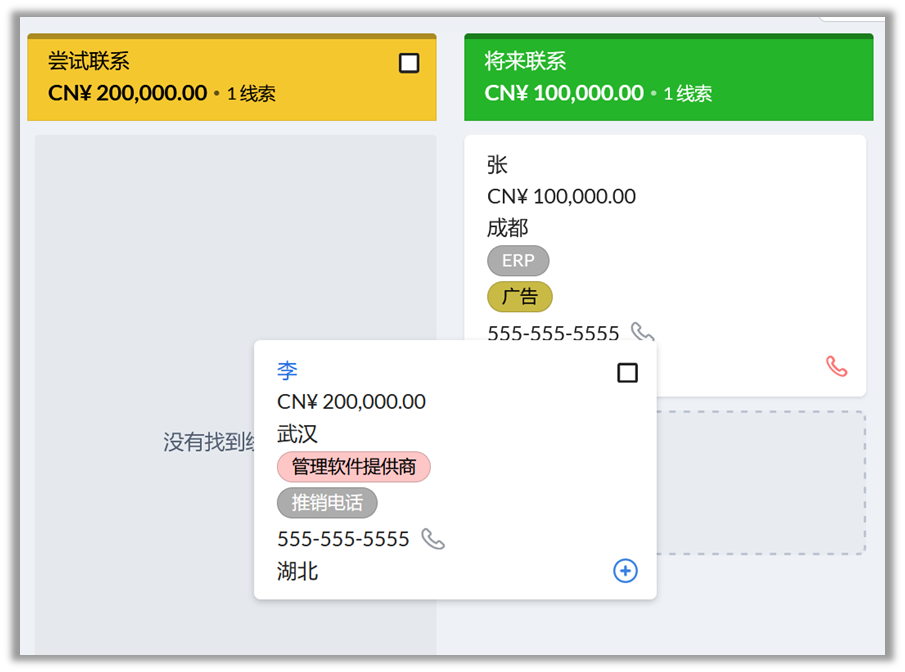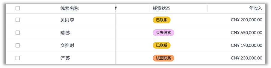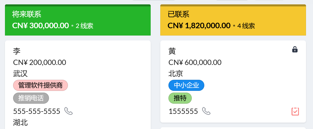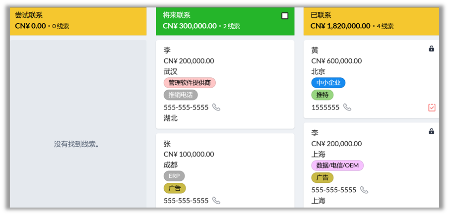 下面例子中,线索根据其当前状态以及收益列出。信息展示方式有两种:列表视图看板视图。
