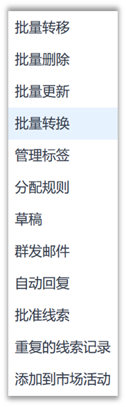 • 批量操作 - 您可以批量发送电子邮件、创建任务、创建宏等。从更多操作图标中,您可以更改所有者、批量更新字段、批量转换线索或删除线索。
