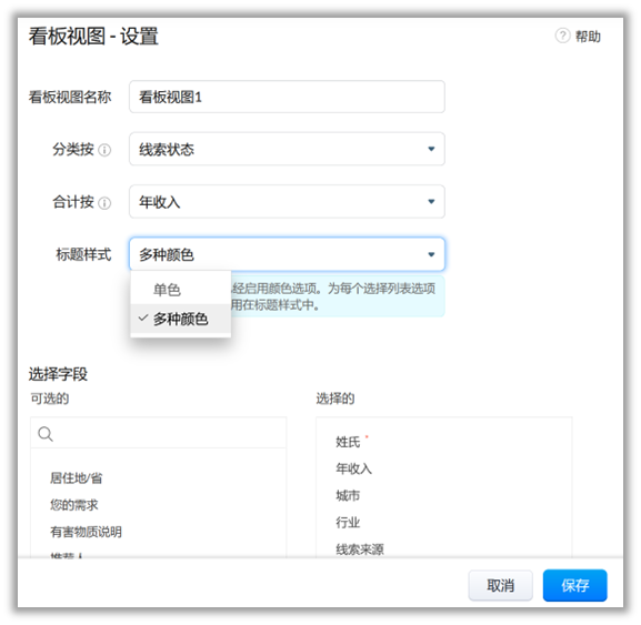 • 看板视图名称—您可以为创建的看板视图输入任何名称,例如线索详情