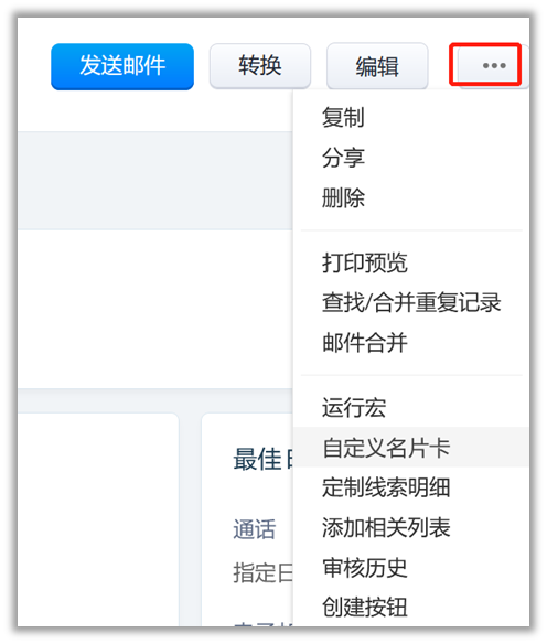 - 在 记录详情 页面中,点击 更多 图标并选择自定义名片卡。