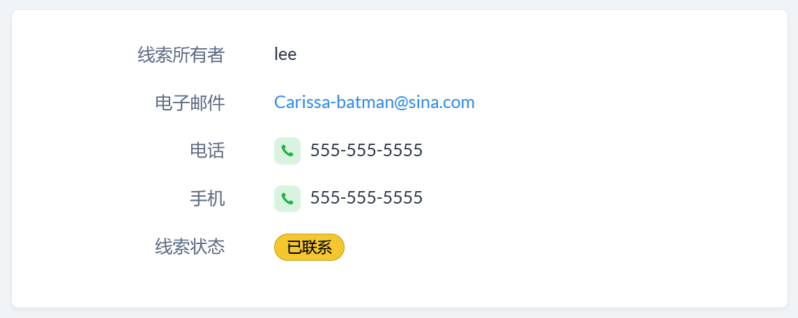 “记录详情”页面中的“名片”视图提供了诸如记录所有者、电子邮件地址、电话号码等详情的快速预览。有时,客户在与客户通话或共享时可能需要在名片中查找更多信息。为此,您应能够选择必须对客户可见的字段。因此,我们允许根据您的需要定制名片。