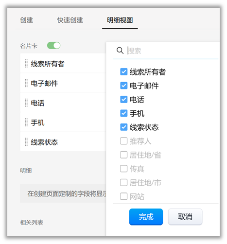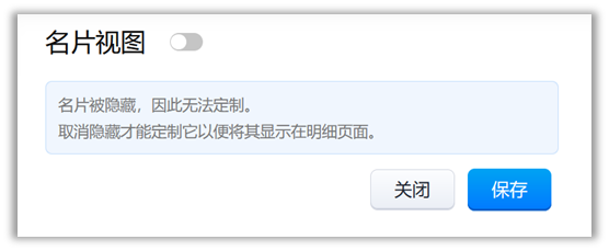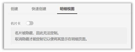 此操作将在记录详情页面中隐藏名片。但是,用户将光标至于查找字段上时,名片仍可见。