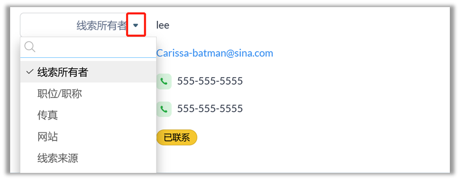 您可直接替换记录详情页面中名片的字段。将光标放在字段上并点击下拉箭头并从列表中选择所需字段。