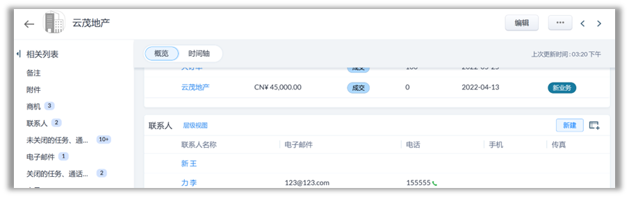 一个模块中的记录与另一模块中的记录相关时,关联记录将显示在父模块的相关列表中。例如,如果云茂地产有两个相关联的联系人,那么联系人详情将显示在该客户的相关列表中。
