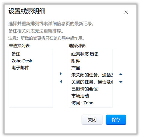 在各模块中均有提供管理页面详情的选项,用于更改相关列表视图的顺序。此外,您还可根据机构需求使用此功能显示或隐藏一些相关列表。