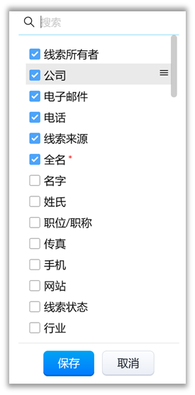 “搜索布局”可帮助您定制想要在搜索结果中查看的字段值。例如,按姓名搜索线索时,您可能想要查看电子邮件、电话号码、线索类型和线索来源字段中的值。您可以在“搜索布局”中选择这些字段。最多可选择 10 个字段。