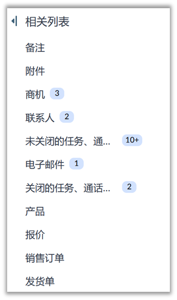 默认情况下,Zoho CRM 中的标准模块在相关列表中显示以下项:产品、未关闭的活动、市场活动等等。所以,您可从父模块的记录详情页面访问这些详情。