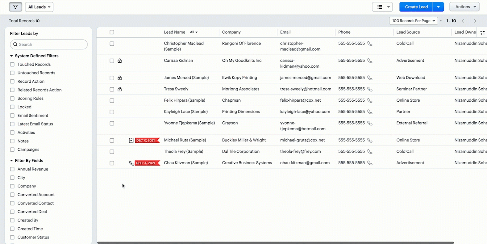 此外,您可以根据预定义的过滤器筛选列表视图上的记录。