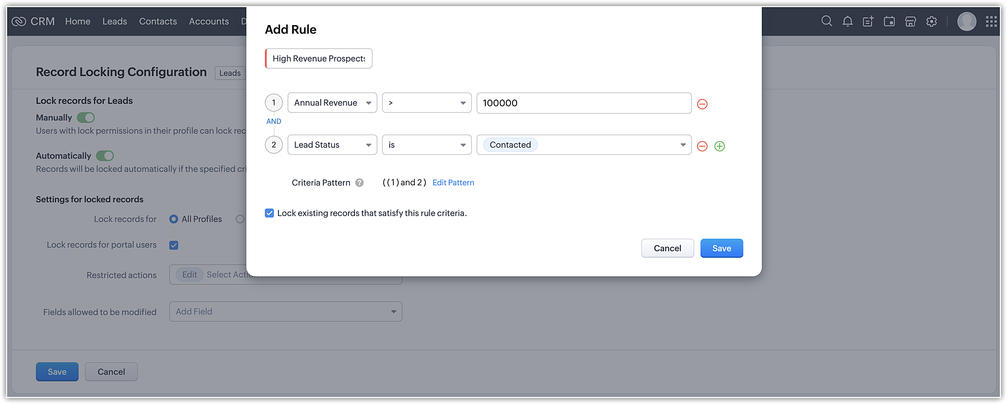 - 每个模块最多可以设置五个规则。每个规则都有一个规则名称,当记录被锁定时,该名称将显示在记录详细信息页面中。