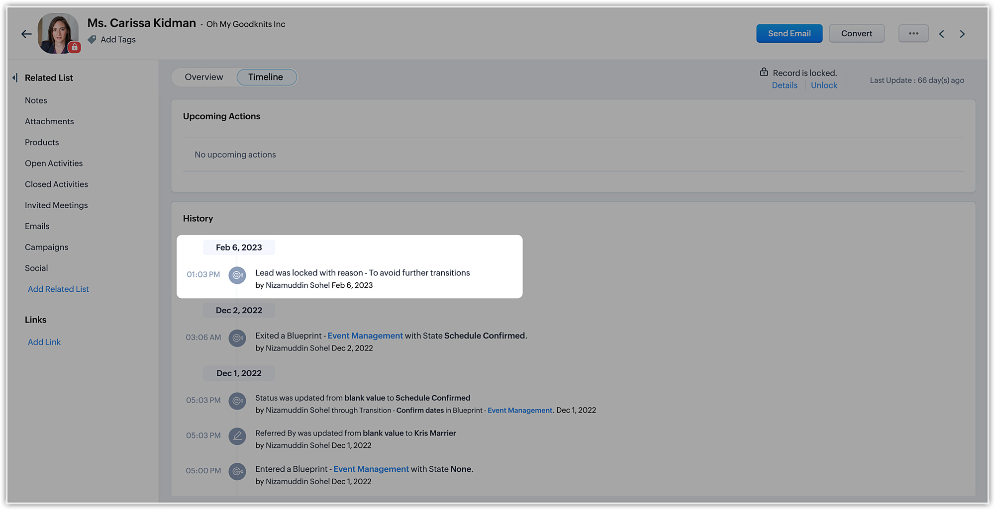 - 但是,锁定的记录不能作为相关列表记录关联其他父模块。因为关联记录时需要更新锁定记录的查找字段。但是,记录已锁定无法更新查找字段。所以,锁定的记录无法作为相关列表关联其他模块的记录。