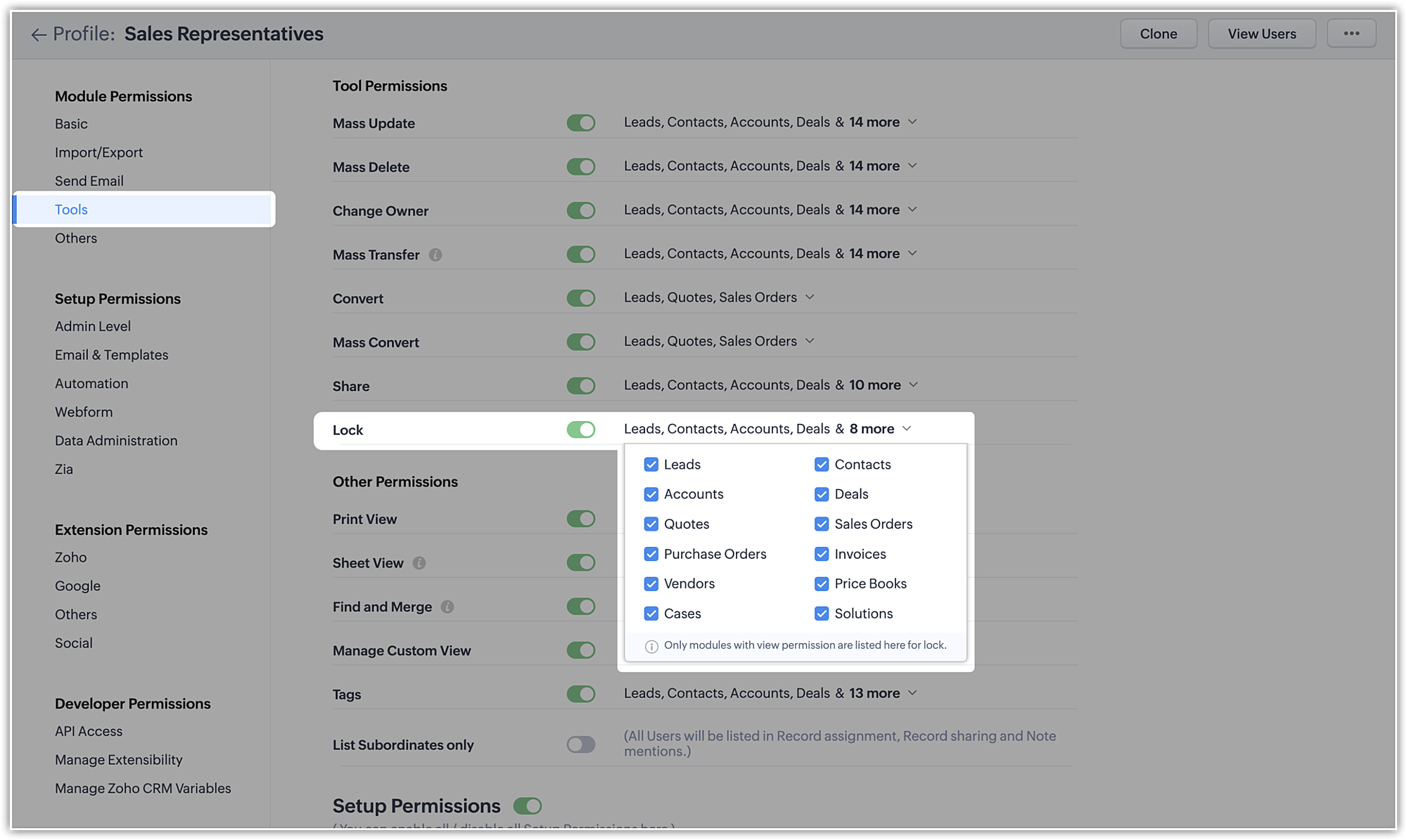 可在【角色】>【工具权限】中启用相应模块锁定权限。
