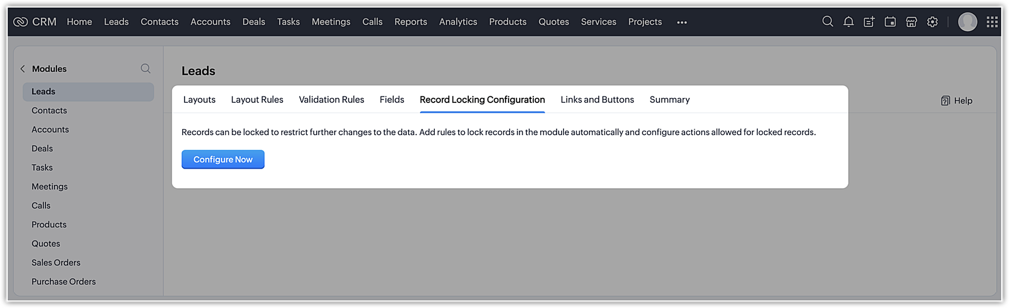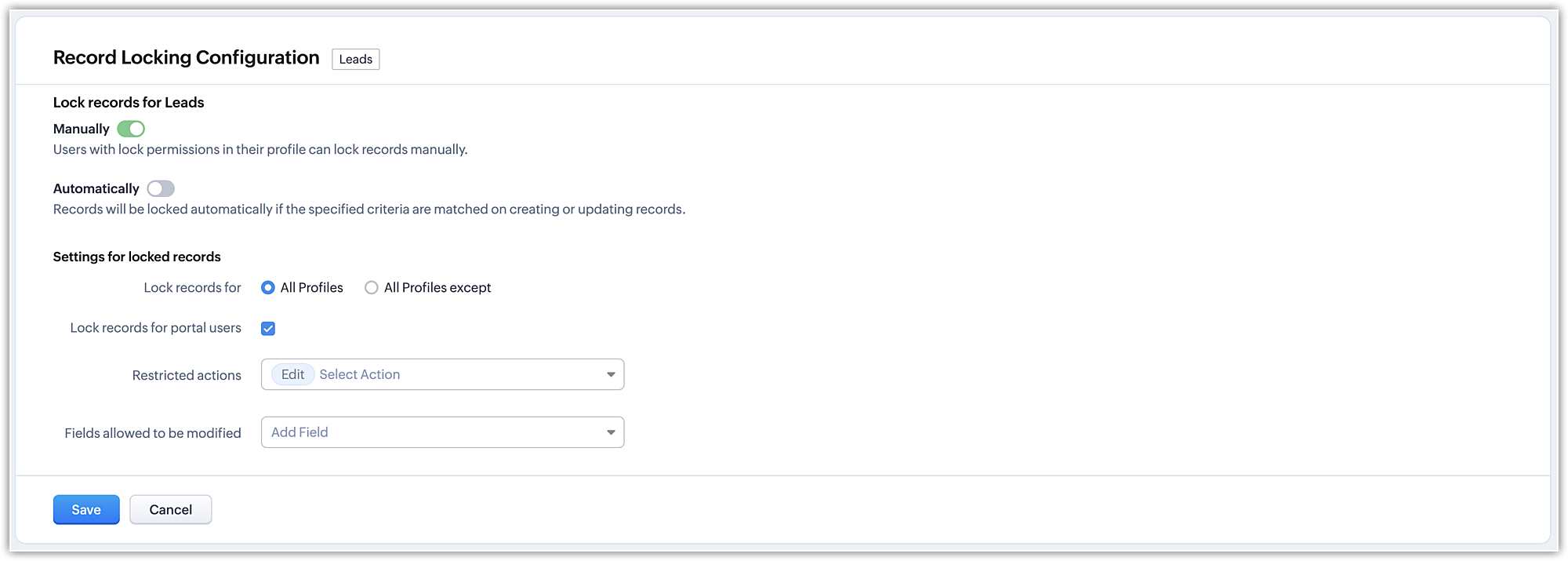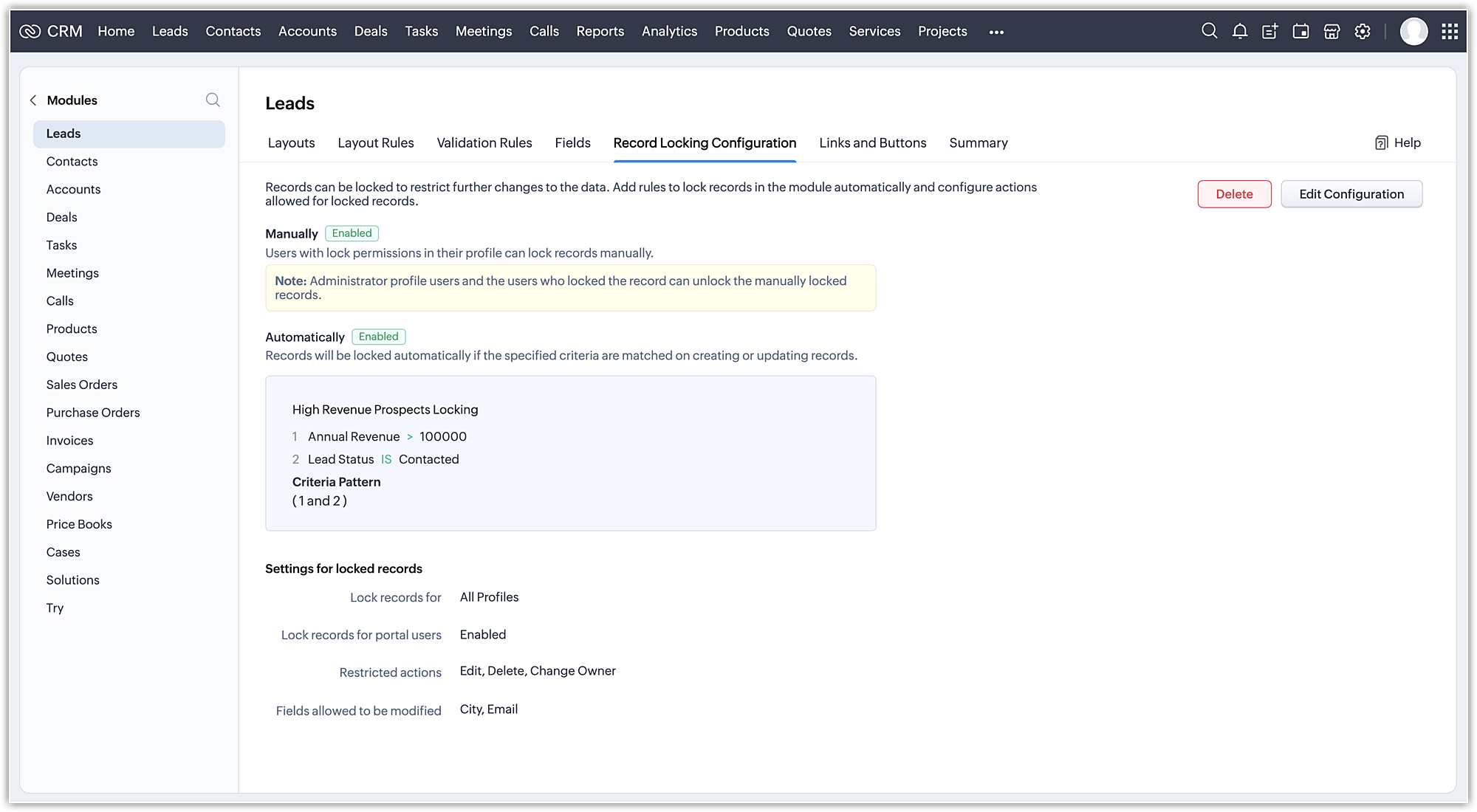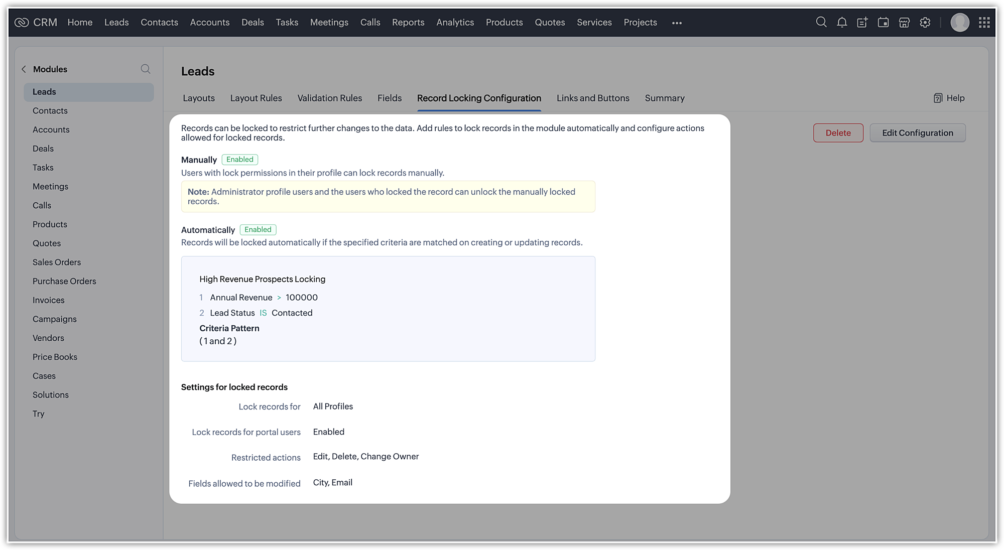 您可以为不同的模块设置锁定配置,以手动或自动锁定记录。