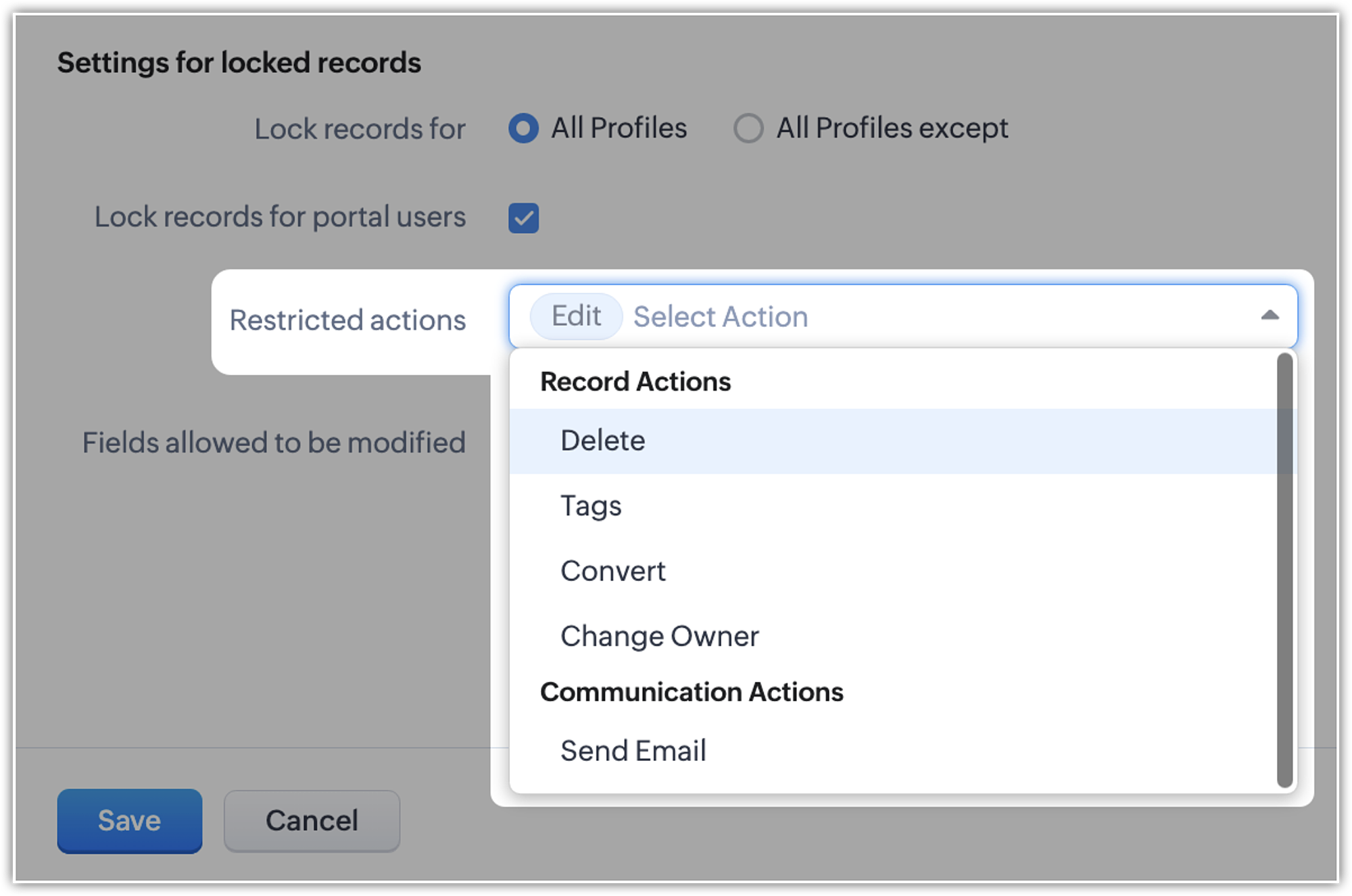 - 您可以选择被限制的操作。默认情况下,“编辑”受限。