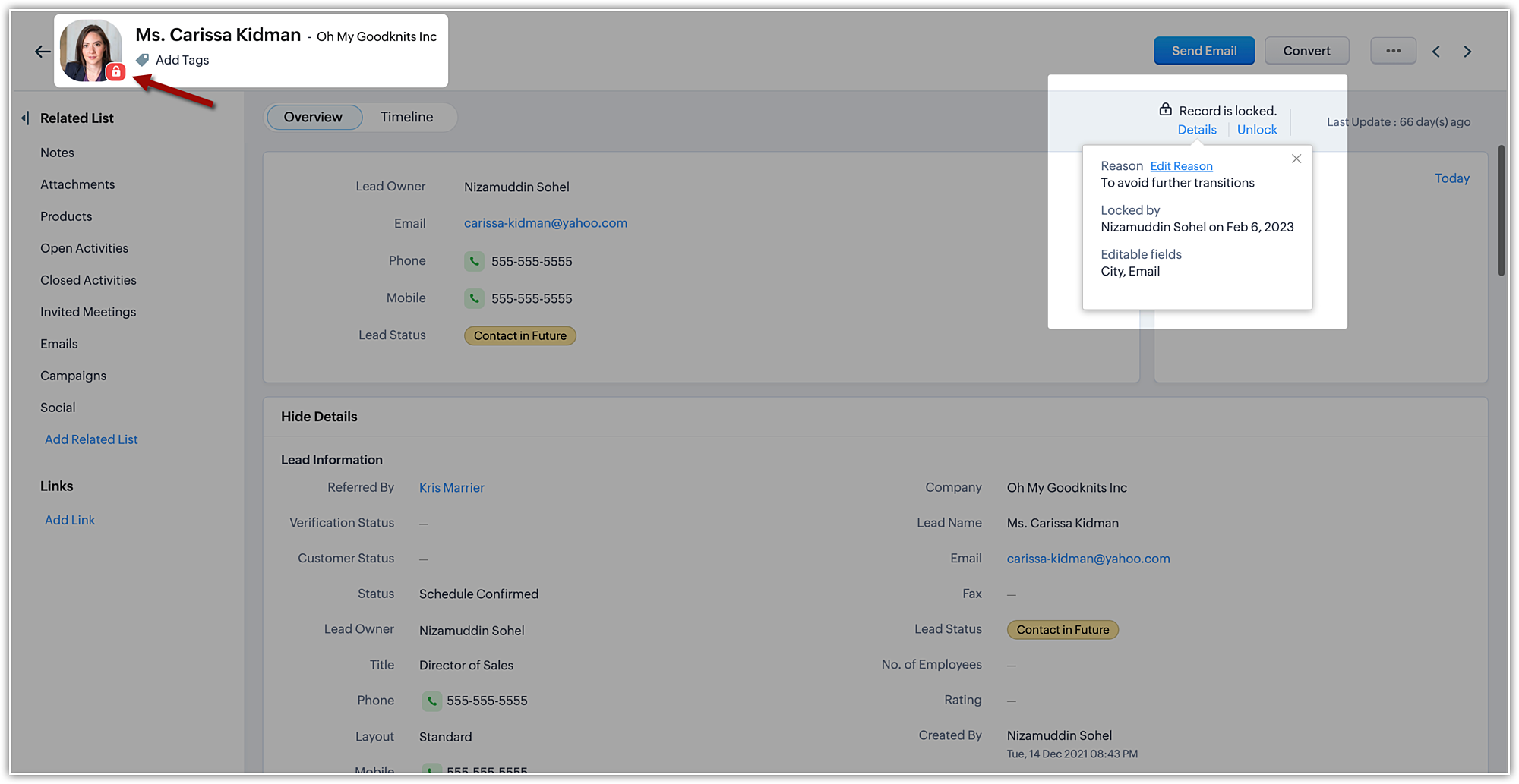 记录锁定后,锁定图标将显示在记录图片上或记录名称旁边。只有允许编辑的字段才可编辑。锁定的详细信息,例如原因(即锁定条件)、锁定时间和可供编辑的字段将显示在【详情】按钮上。