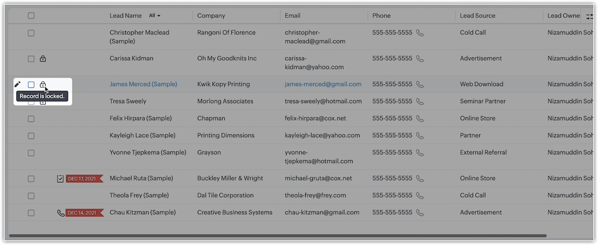 - 列表视图: 在列表视图,锁定记录会显示锁定图标。