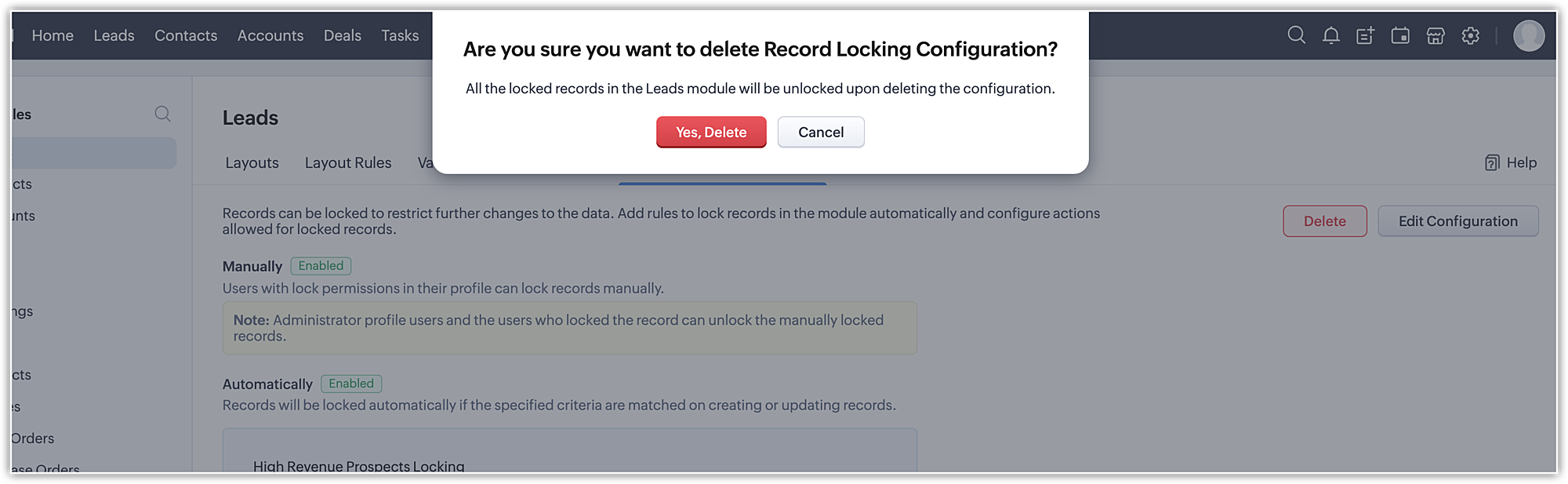 - 如果删除记录锁定规则,则通过这些规则锁定的记录将自动解锁。如果删除锁定配置,模块中的所有记录都将解锁。
