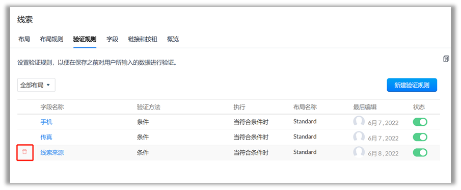 删除验证规则时,规则及关联的提醒消息都会被删除。当您想要删除与验证规则相关联的字段时,系统将提示您先删除规则,然后才能删除该字段。