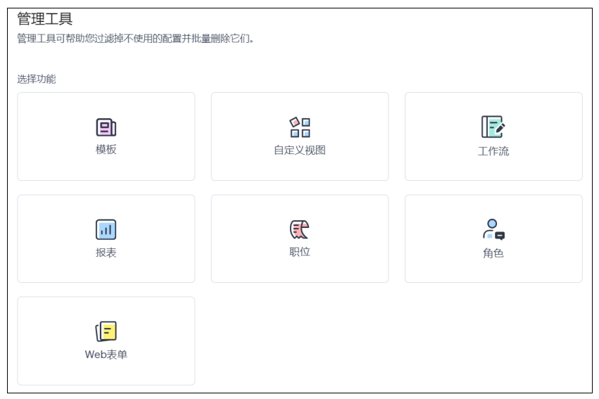 管理工具可以帮助您删除不需要的模板、自定义视图、工作流规则、报表、职位、角色以及web表单