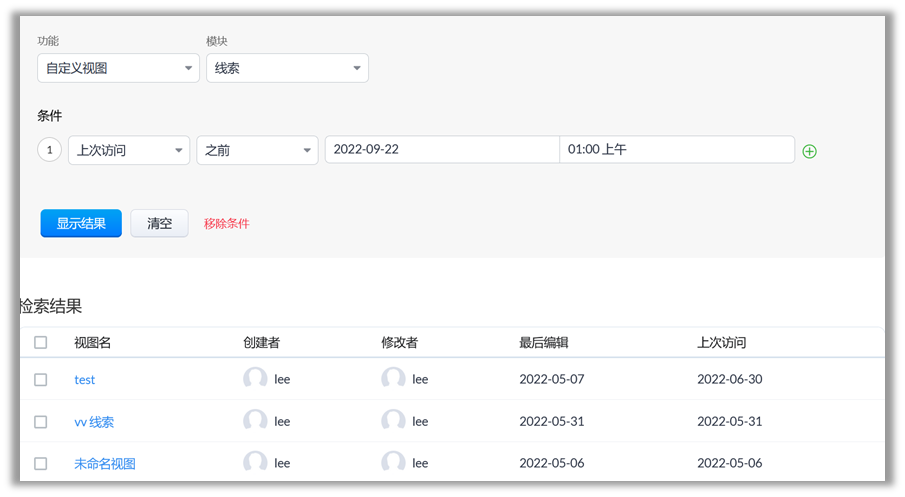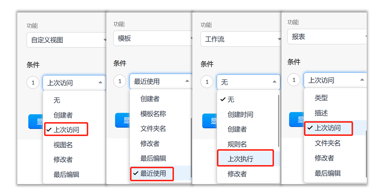 在任意CRM账户中,可能需要基于时间条件过滤不再使用的配置。任何最后一次使用在很久之前的配置都可以移出系统。“上次访问”条件可用于所有设置—自定义视图,报表,工作流以及模板。