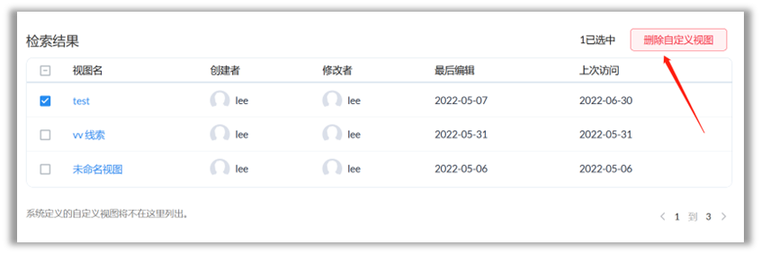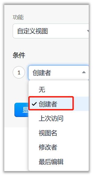 某些情况下,可能需要过滤出特定用户所做的设置。例如,用户李明辞职后,需要删除所有李明创建的自定义视图。您可以使用“创建者” 并选中该用户。将显示满足所述条件的自定义视图,可以全选并进行删除。