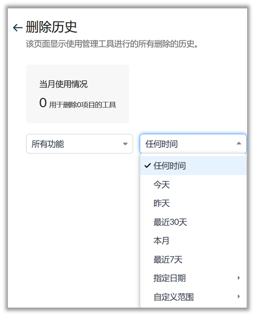 可以根据功能和时间查看通过管理工具进行删除的操作历史。