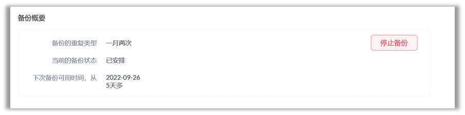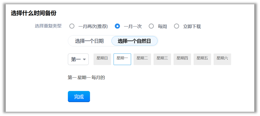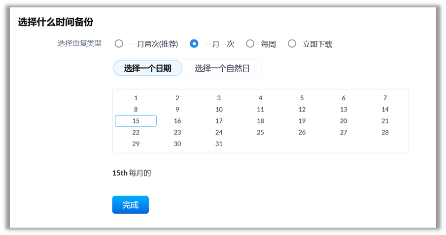 基于您选择的时间间隔,每月进行两次数据备份。例如,如果您选择“星期一”,那么每隔一周的星期一就可以下载备份。
