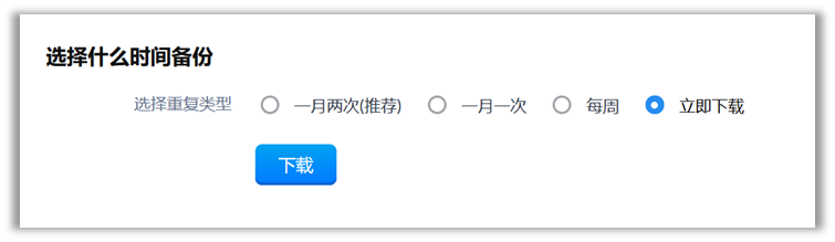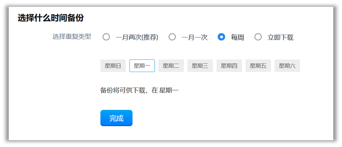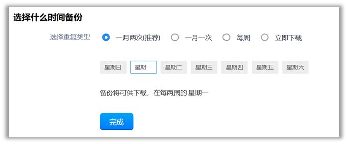 每周将下载一次数据备份,您可以选择下载备份的时间。 例如,如果选择周一,那么当月的每个周一都将进行数据备份。