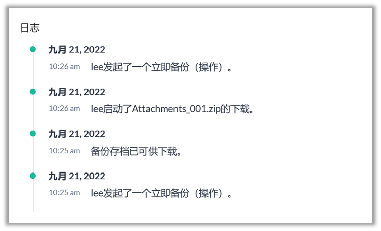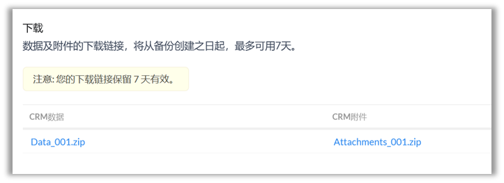 一旦数据备份已就绪,具有管理员权限的用户就可以下载它。数据和附件将分组到不同的 .zip 文件夹中。