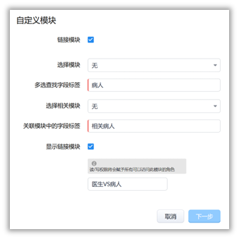 您还可以将其作为一个链接模块来创建。例如,您可以创建一个名为“医生”的新模块,并将其与“病人”模块关联起来,在此界面就可操作。