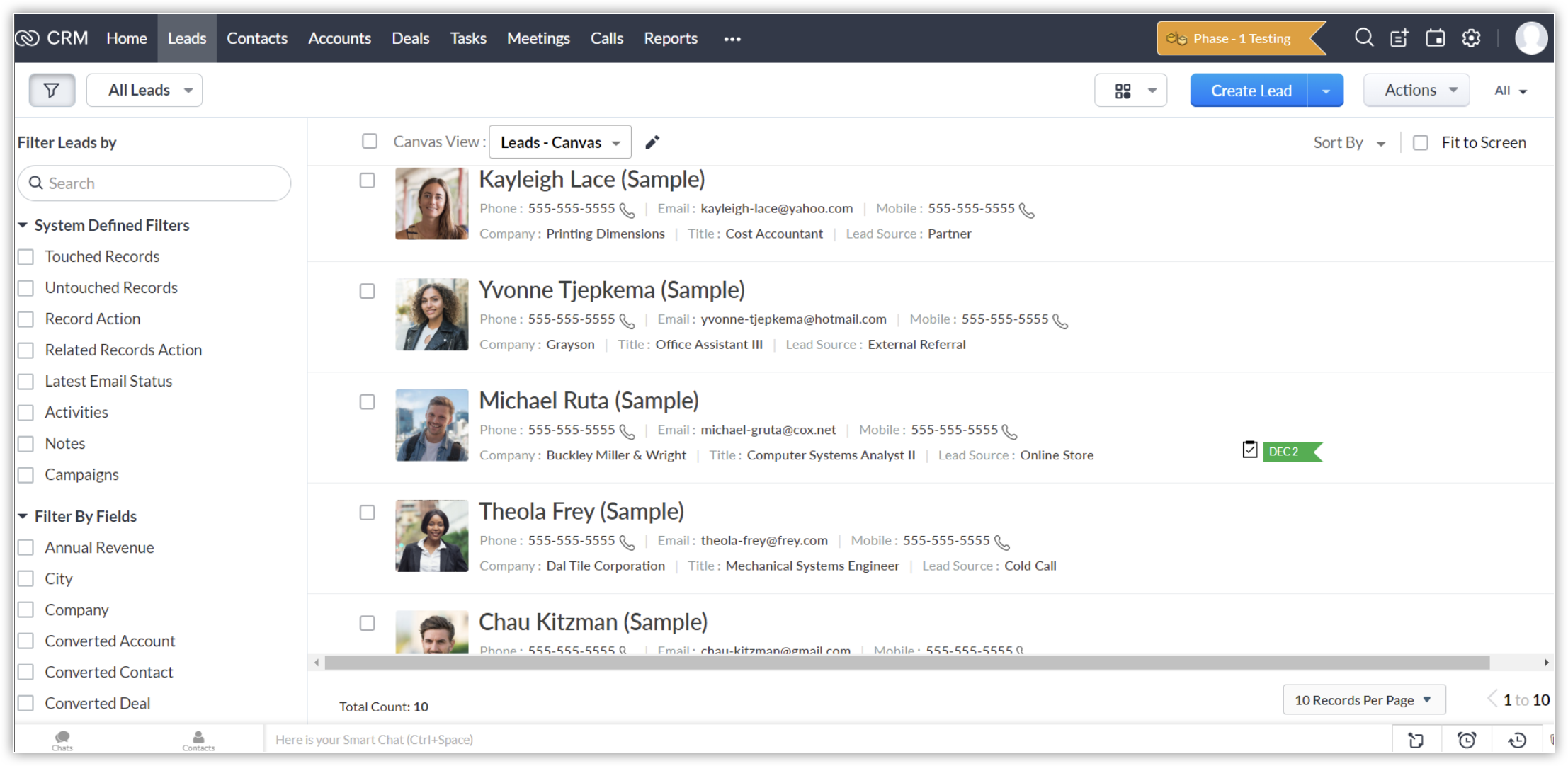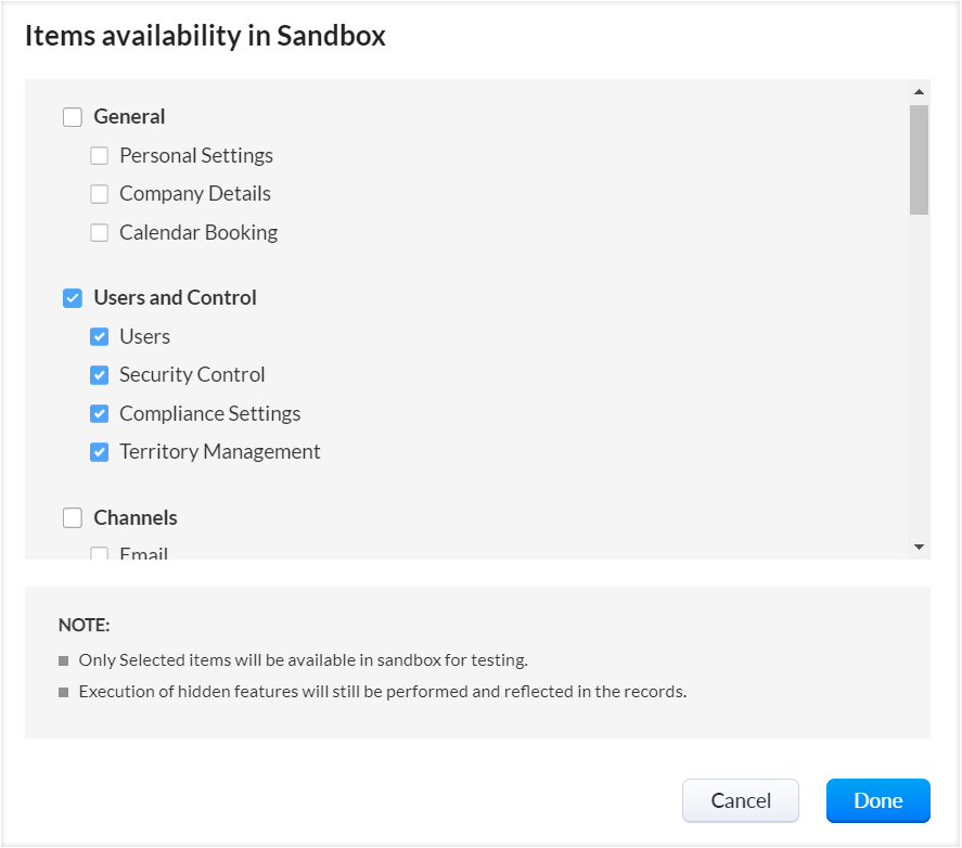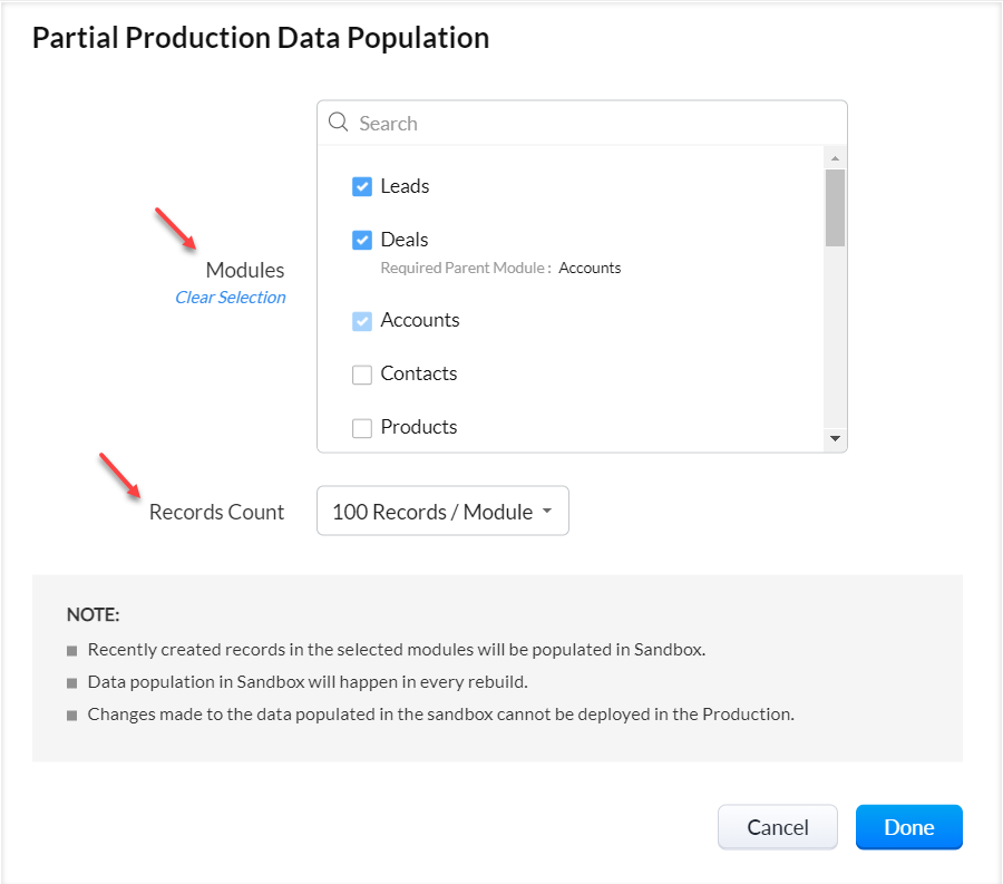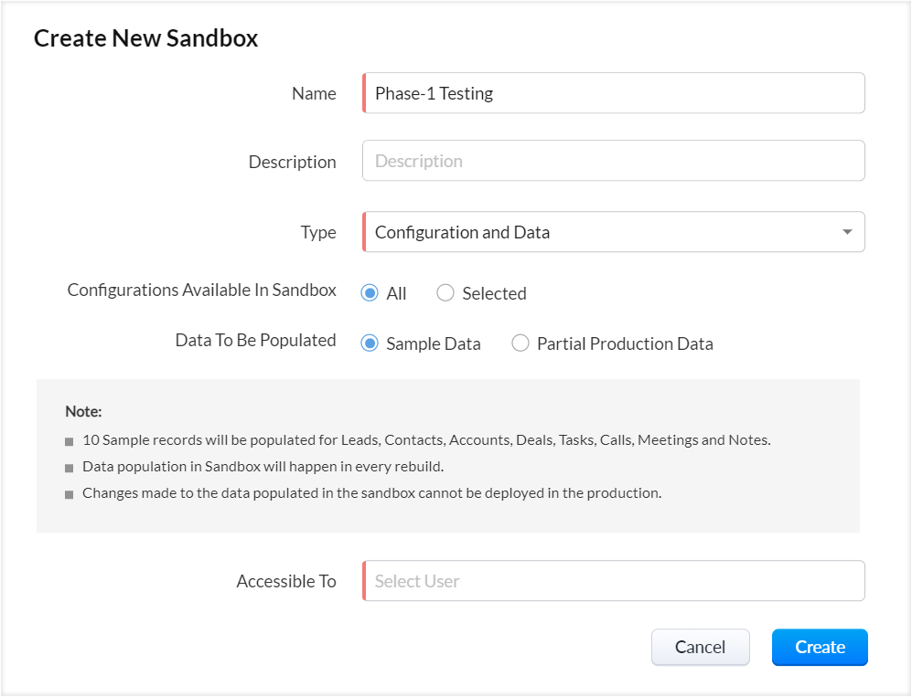 (i) 示例数据填充 : 如果您希望节省花费在手动创建记录或将它们导入沙盒帐户上的时间,或者不希望开发人员或用户查看CRM记录,您可以填充用于测试的样本数据。 选择此选项后,将分别为线索、客户、联系人、商机、任务、通话、会议和备注模块填充10条示例记录。 您可以访问相应模块下的记录,并根据需要进行编辑。 在部署期间,这些记录不会被填充到CRM帐户中。