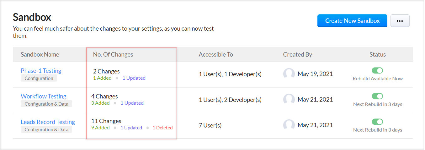 在其角色中具有管理沙盒 权限的用户可以通过转到 CRM设置 > 数据管理 > 沙盒 来查看创建的沙盒帐户列表。 此页面将分类并显示有关沙盒帐户的所有必要信息,例如帐户名称、更改、可访问的用户和开发人员、创建日期和状态。