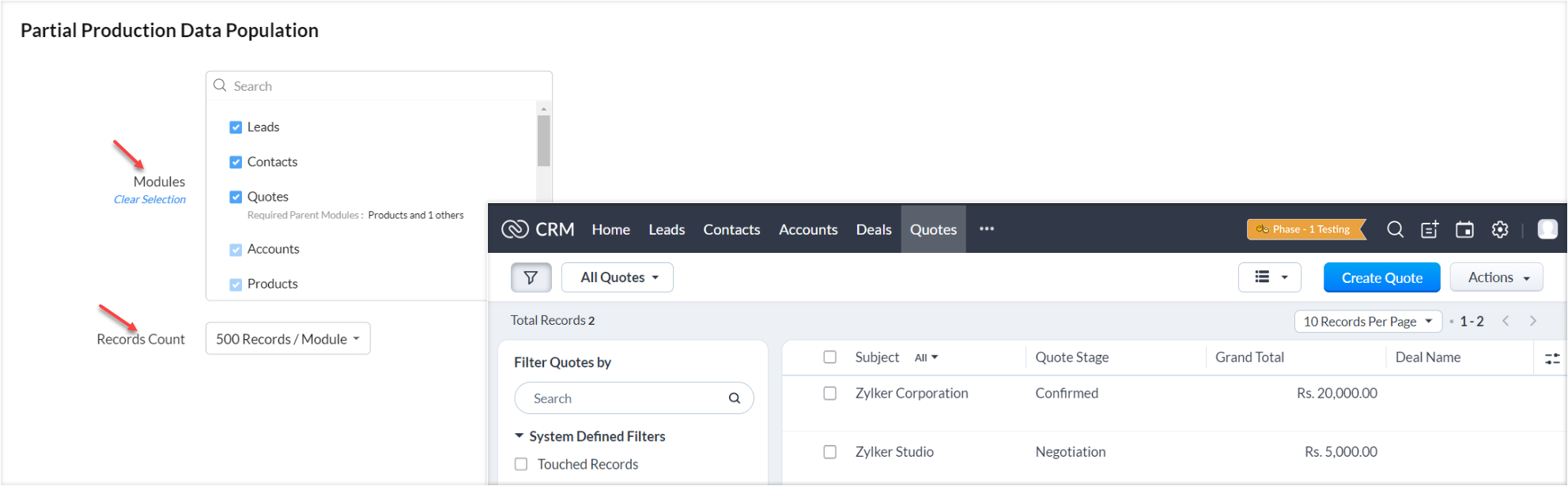 如果您希望看到CRM记录发生的确切变化,您可以将一些CRM数据填充到沙盒环境中。您可以选择应该在每个模块中填充的记录数量。 您还可以选择需要在沙盒帐户中填充数据的特定模块。