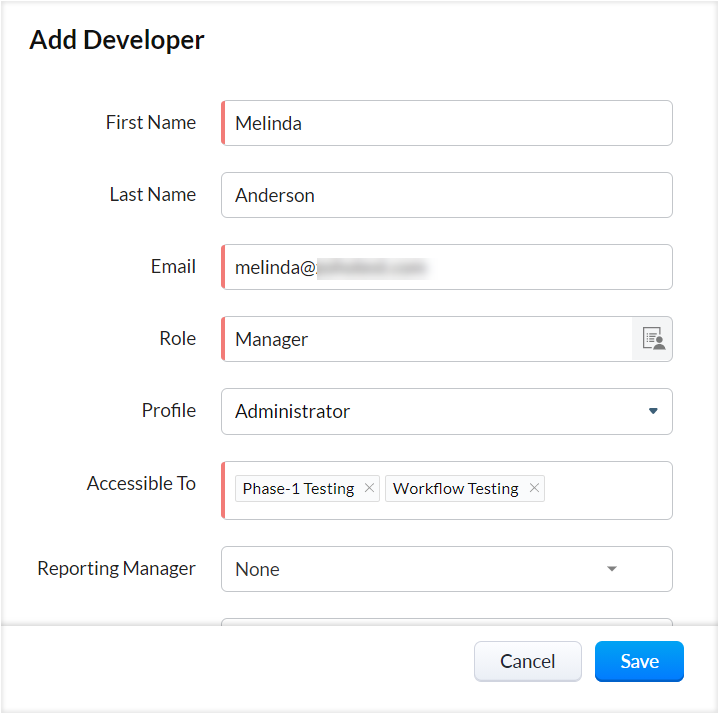 - 必须为开发人员分配职位、角色和报告经理。 您可以根据您希望为开发人员提供的记录访问和配置权限来选择现有的CRM职位和角色。例如,具有管理web表单权限的开发人员可以创建和测试web表单。阅读更多关于角色和职位的内容。 可以将高于所选职位的用户设置为报告经理,并且他们将能够访问该开发人员的沙盒