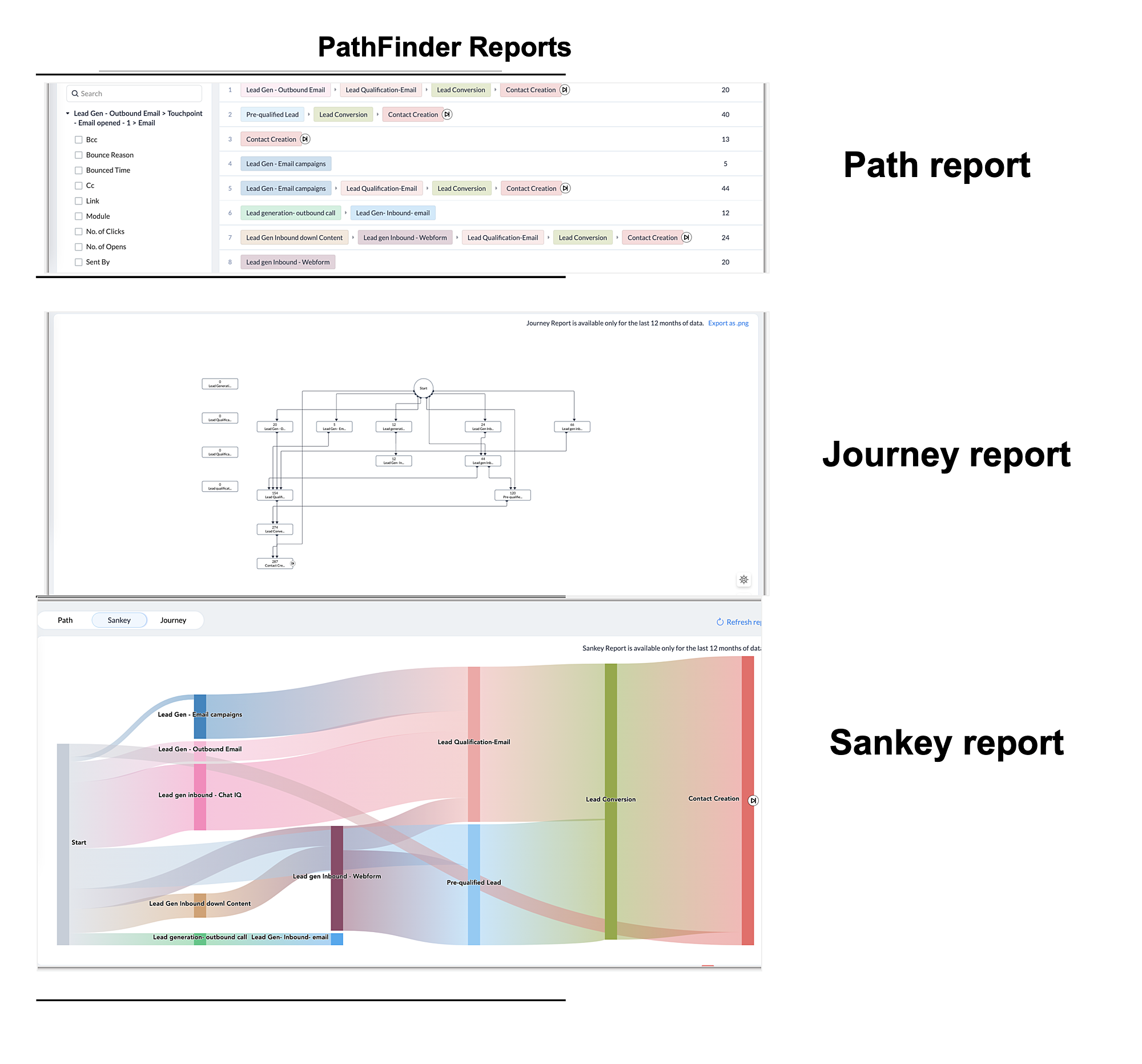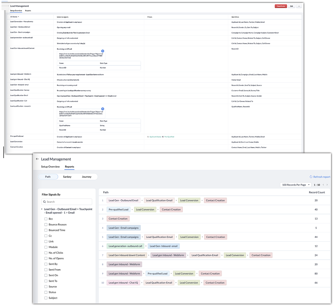 Zoho CRM内的路径探查器 是一种工具,用于捕获与业务的实时交互作为信号,并将其记录为独特的路径,也称为旅程。 它在三种不同的图形报表中描述路径,以便更好地理解观察到的旅程。