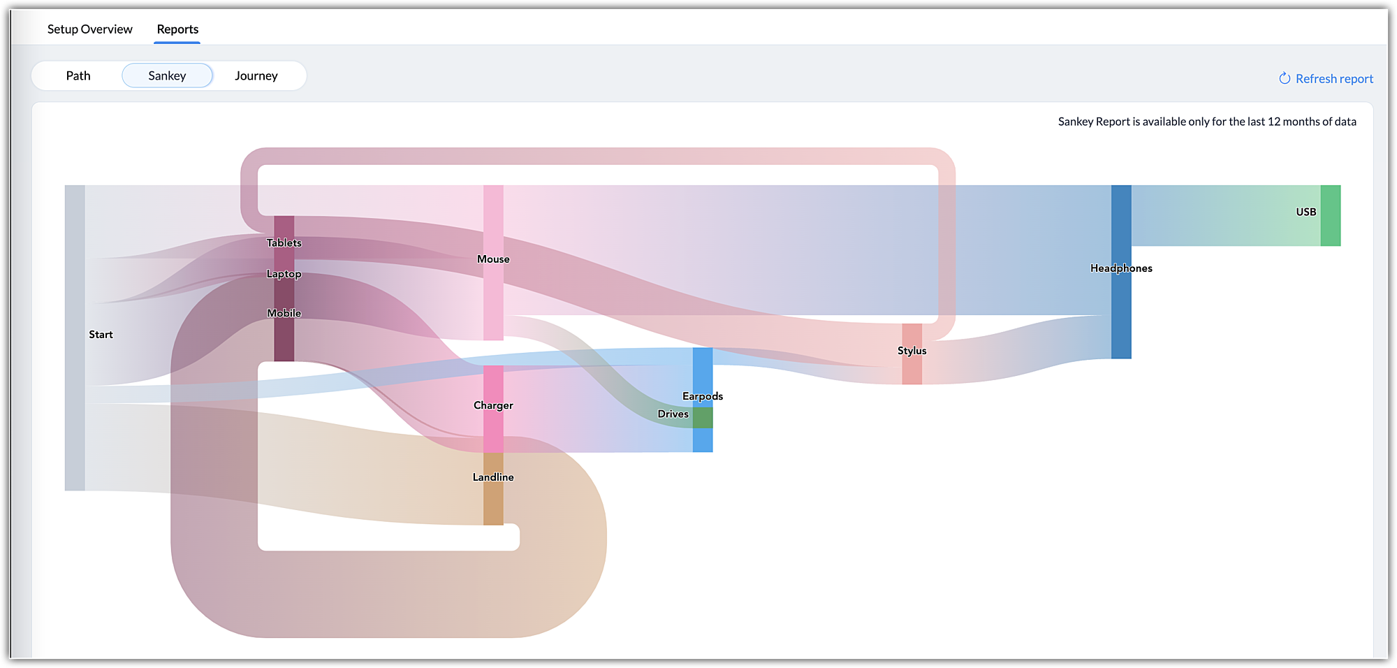 Zylker.com 是一家网上电子商店,销售一系列产品,以满足国内各种技术需求。 为了方便起见,他们将产品分为不同的部分——存储设备、移动设备、计算设备、网络和配件。 正如您所看到的,这些产品适合组合购买。 然而,他们正在尝试发现哪种组合表现最佳。虽然他们总是可以跟踪他们最畅销的产品,但他们需要知道的一件事是,他们的潜在客户是如何选择特定产品的。重要的是要了解他们进入站点时的最初目标是什么,他们从哪个产品访问购物车中的其他产品,是由什么发起了这次导航,等等。 路径探查器可以帮助他们识别访客对不同产品的访问旅程。