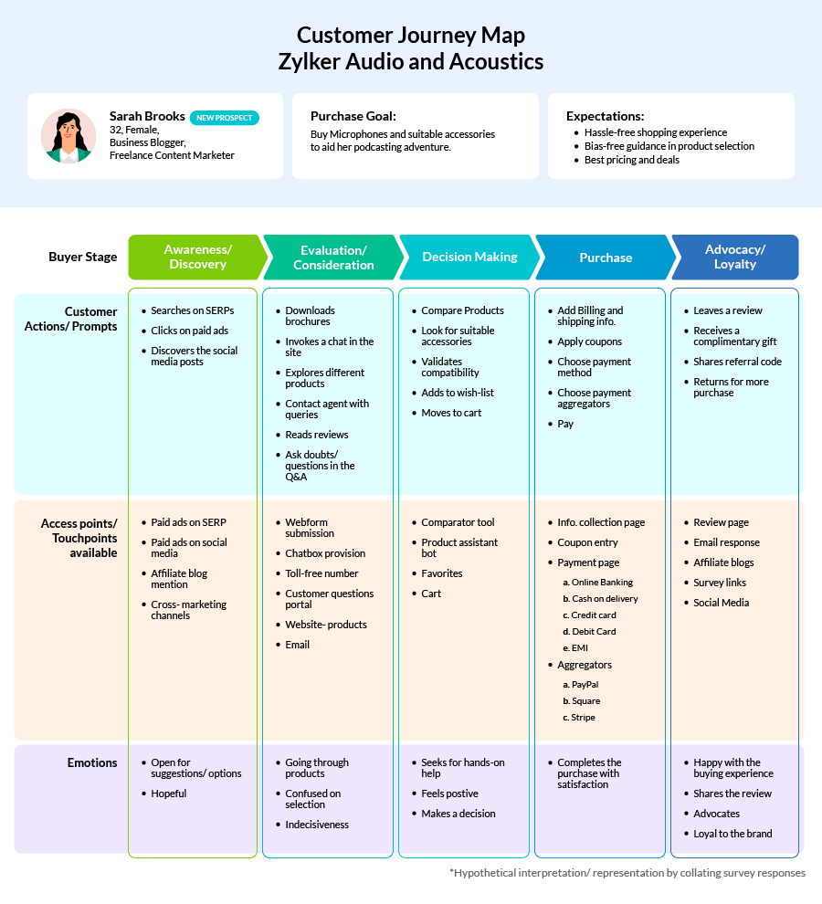 传统的创造客户体验的方法是根据热门交易,想出各种虚构的人物角色和目标,模拟他们的行为和旅程。 他们将每个阶段的假定经历和情绪记录下来,并制定出能够满足他们即时需求的不同产品。 它可能看起来像这样: