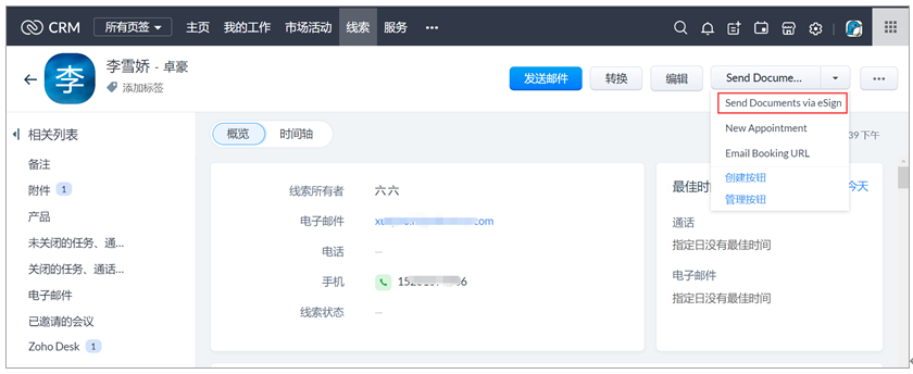 安装后,线索/联系人的详细信息页面将会有一个名为通过eSign发送文件的按钮。此按钮可用于发送需要联系人或者线索签名的文件。