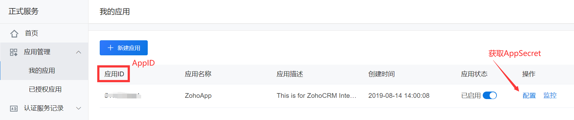 - 进入"控制台-应用管理-我的应用",获取App ID、App Secret