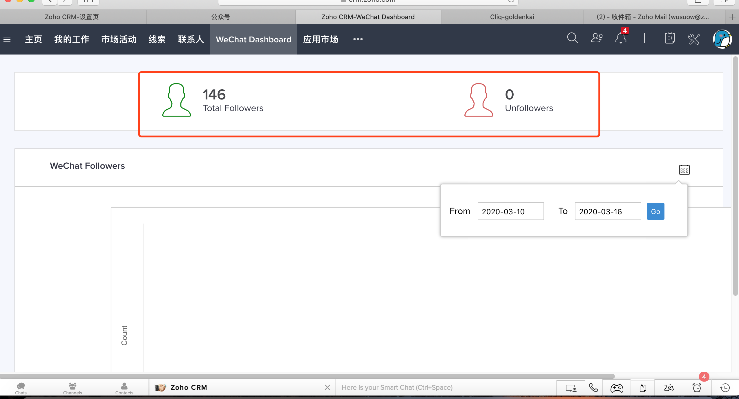 集成后,CRM内会自动生成一个 "WeChat Dashboard"模块,包含几个功能点: