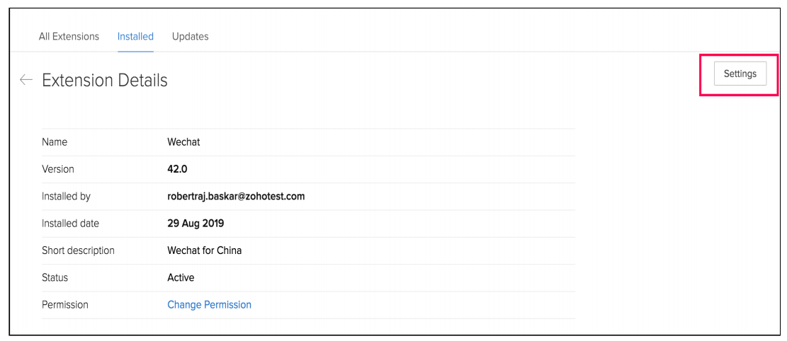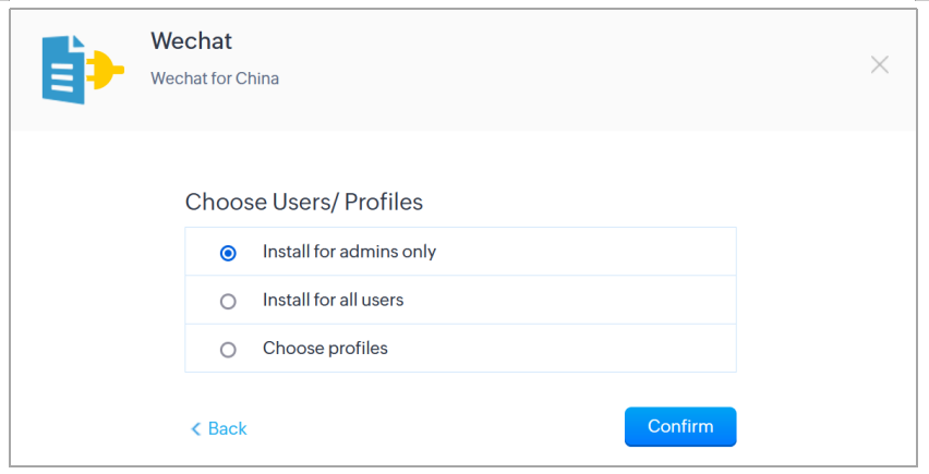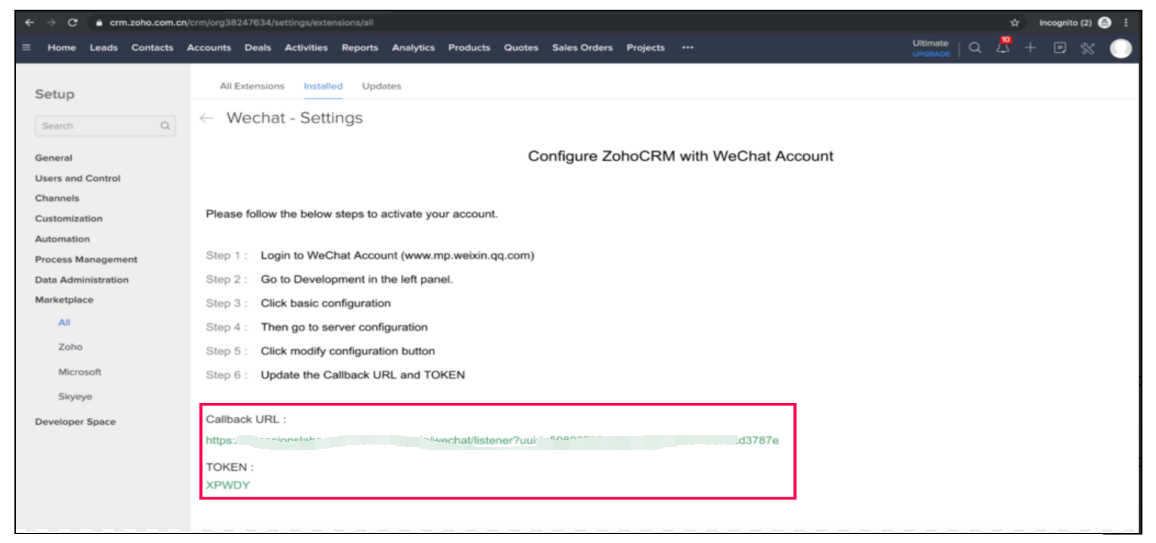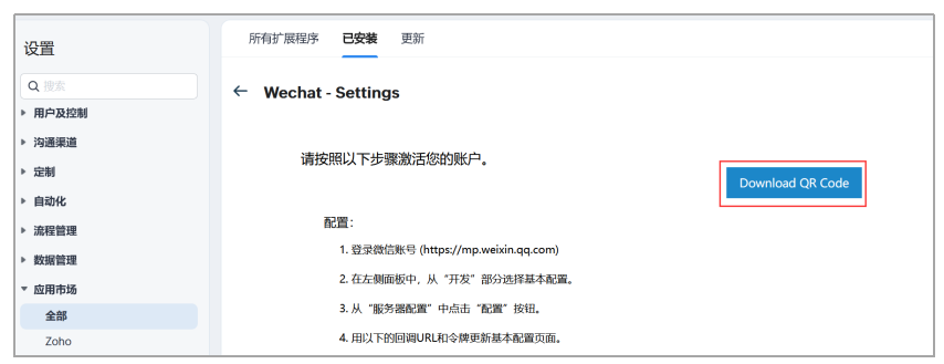 安装之后,应该完成Zoho CRM账户和微信账户之间的配对,以便使用该集成。要配对,请遵循以下配置步骤。