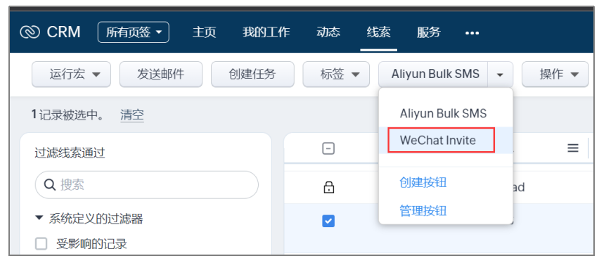 - 访问线索列表视图,选中您想要给其发送微信公众号邀请的线索。